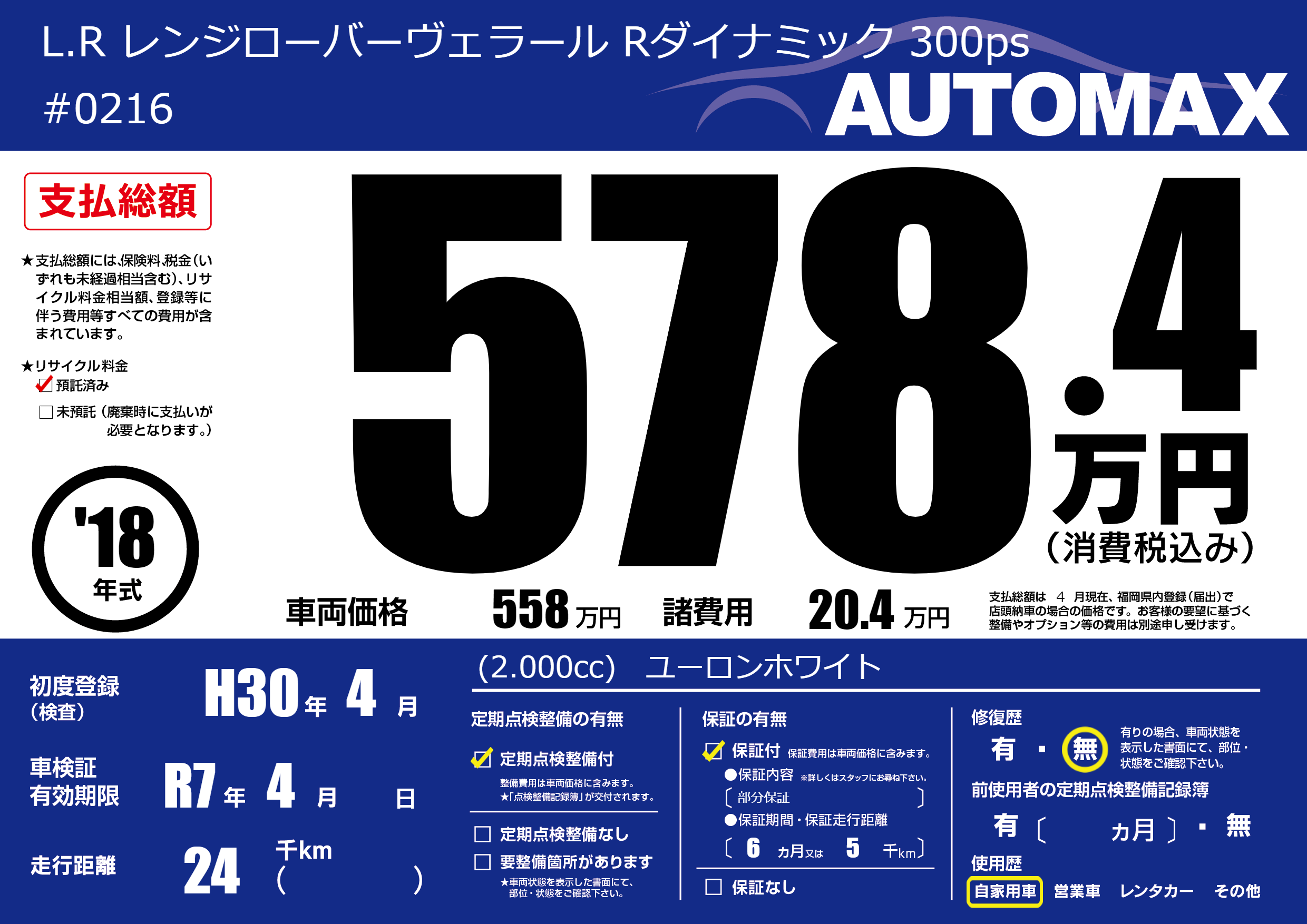 | 車名 | L.R レンジローバーヴェラール Rダイナミック 300ps | グレード ミッション 排気量 |