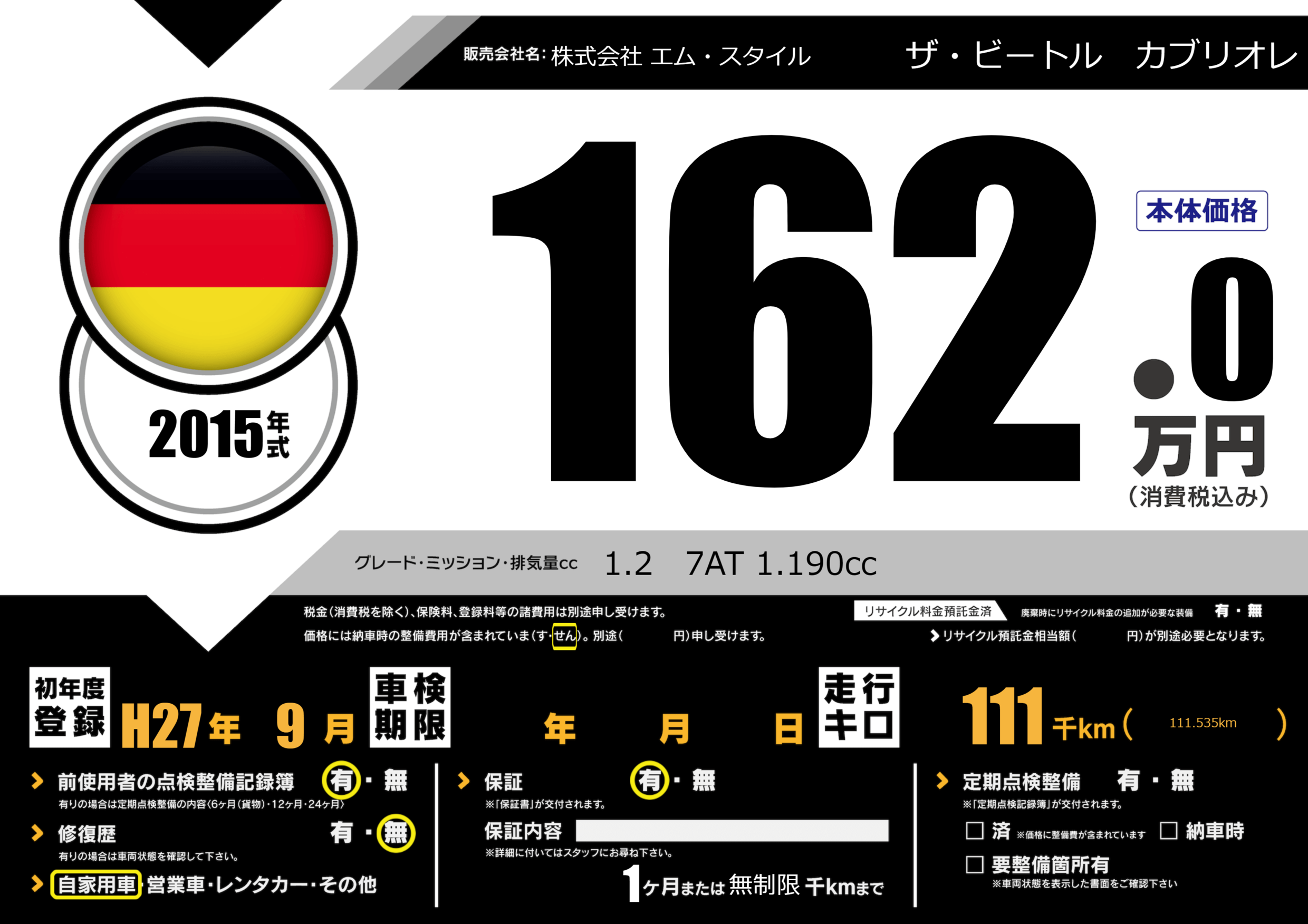 | 車名 | ザ・ビートル カブリオレ | グレード ミッション 排気量 |