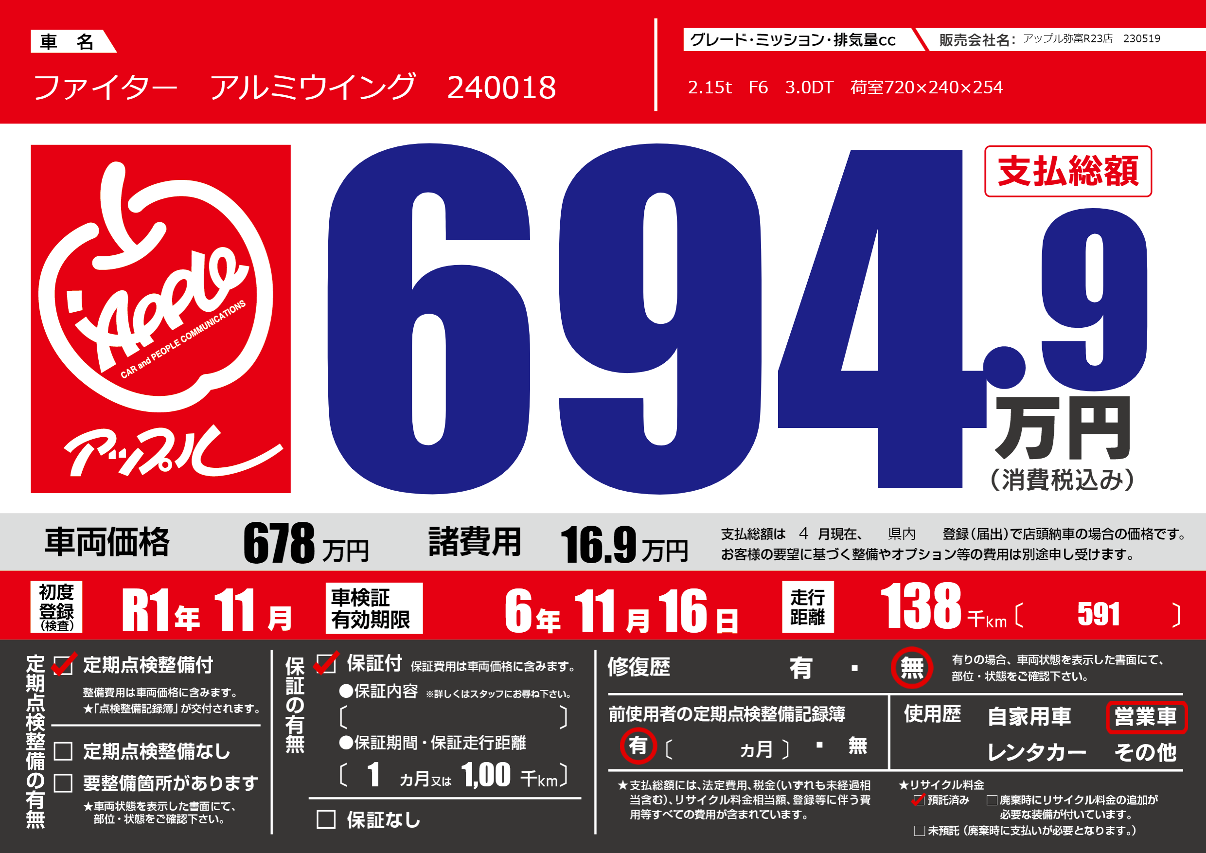 | 車名 | ファイター アルミウイング 240018 | グレード ミッション 排気量 |