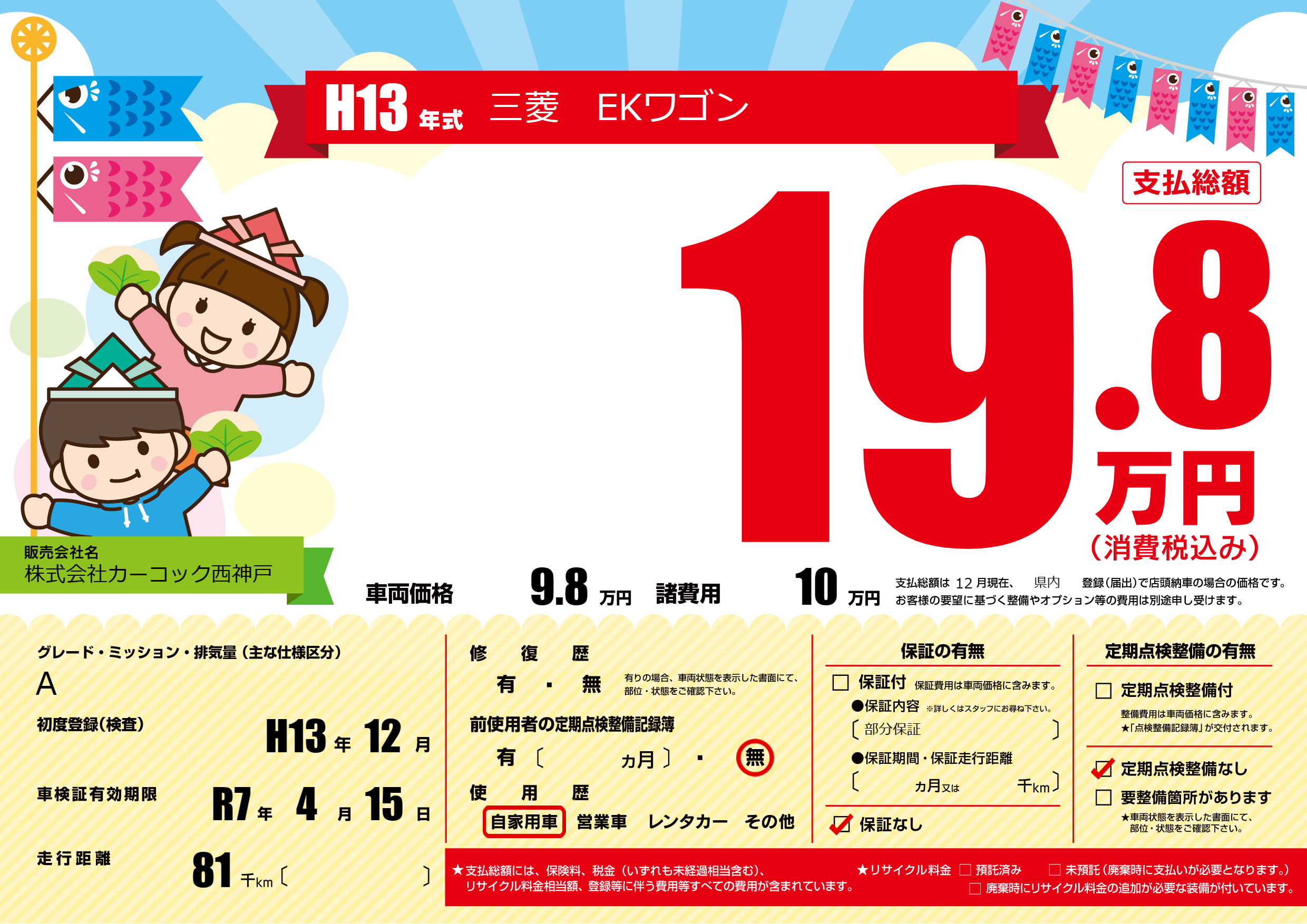 | 走行キロ | 8.1万km | 初年度登録 | H13年12月 |