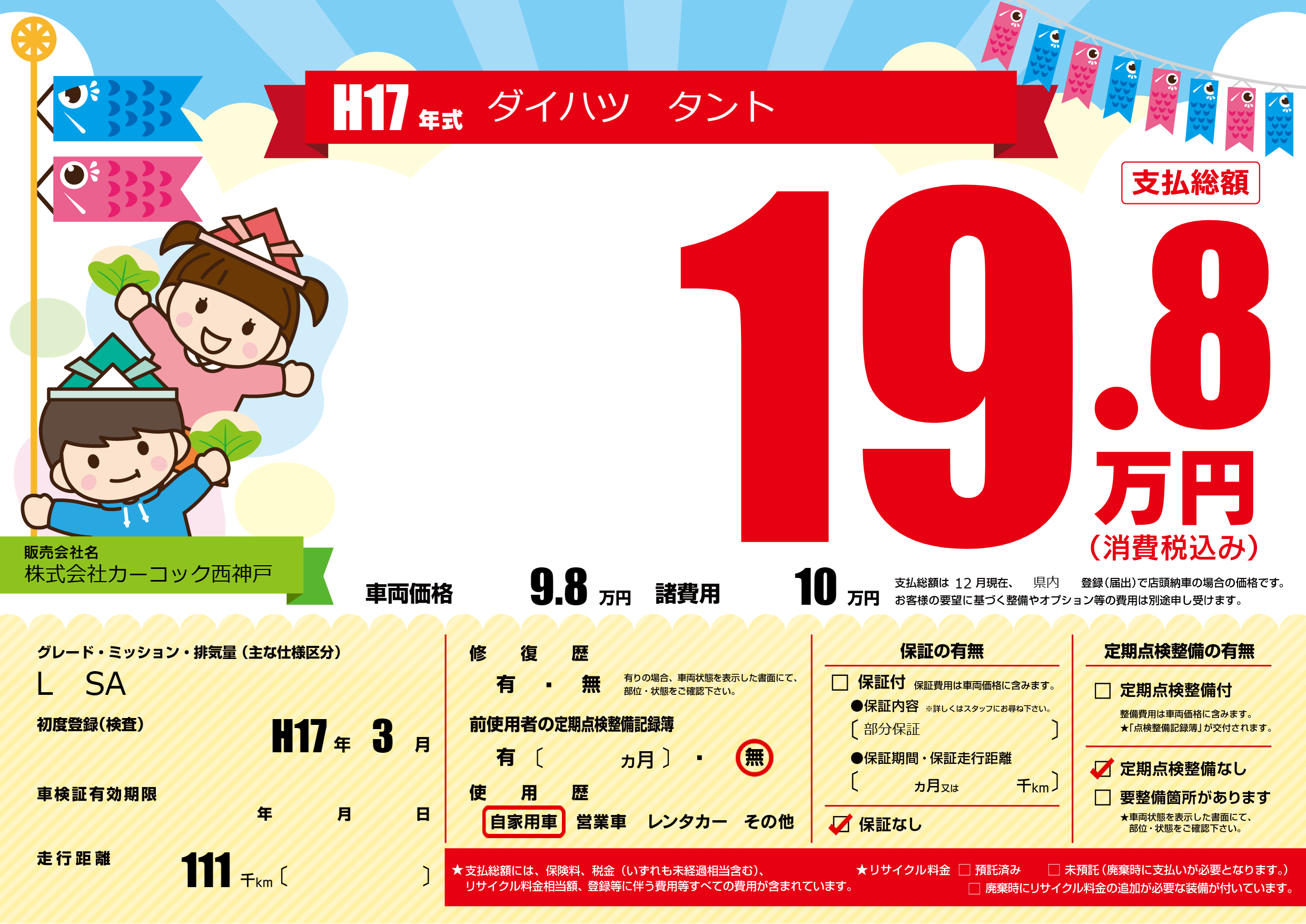 | 走行キロ | 11.1万km | 初年度登録 | H17年3月 |