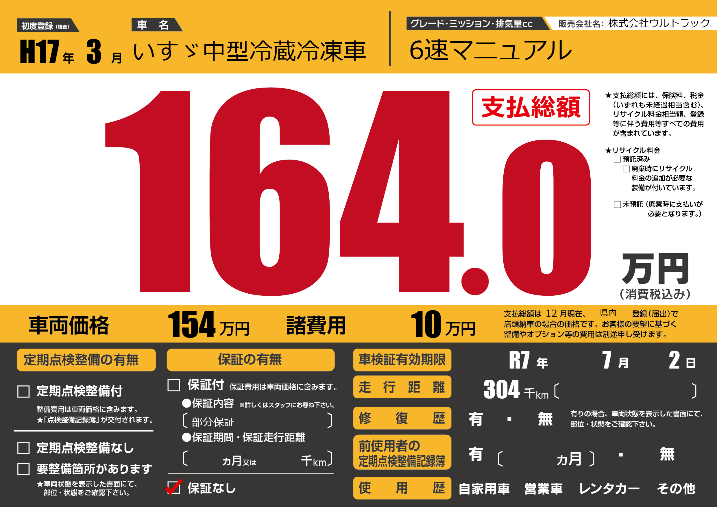 | 車名 | いすゞ中型冷蔵冷凍車 | グレード ミッション 排気量 |