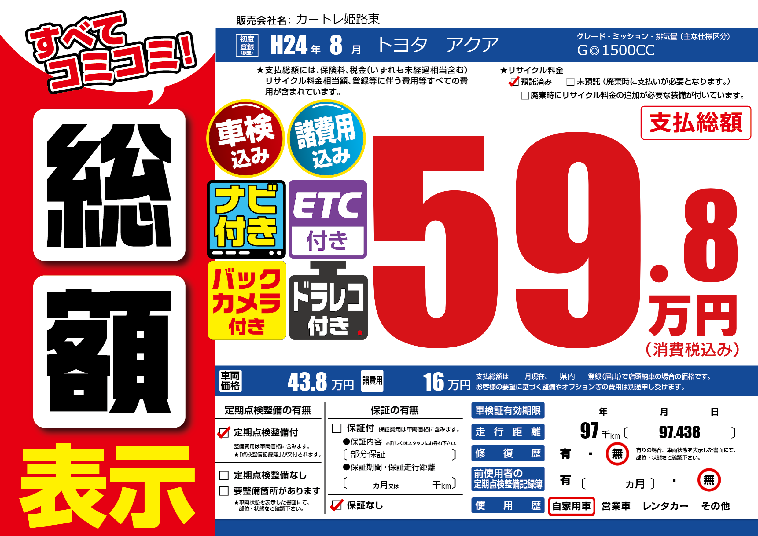 | 車名 | トヨタ アクア | グレード ミッション 排気量 |