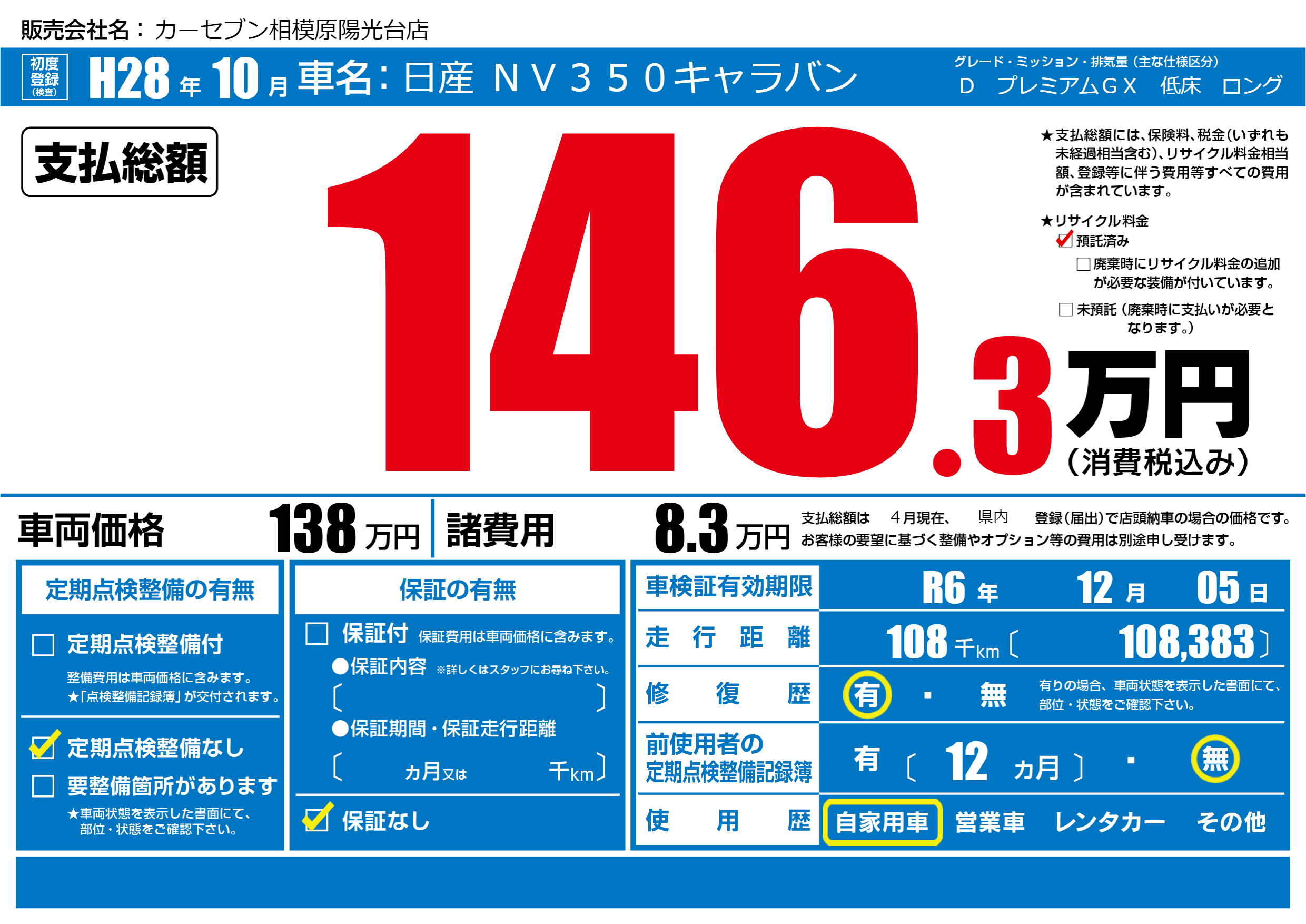 | 車検制限 | R6年 12月 05日 | ||