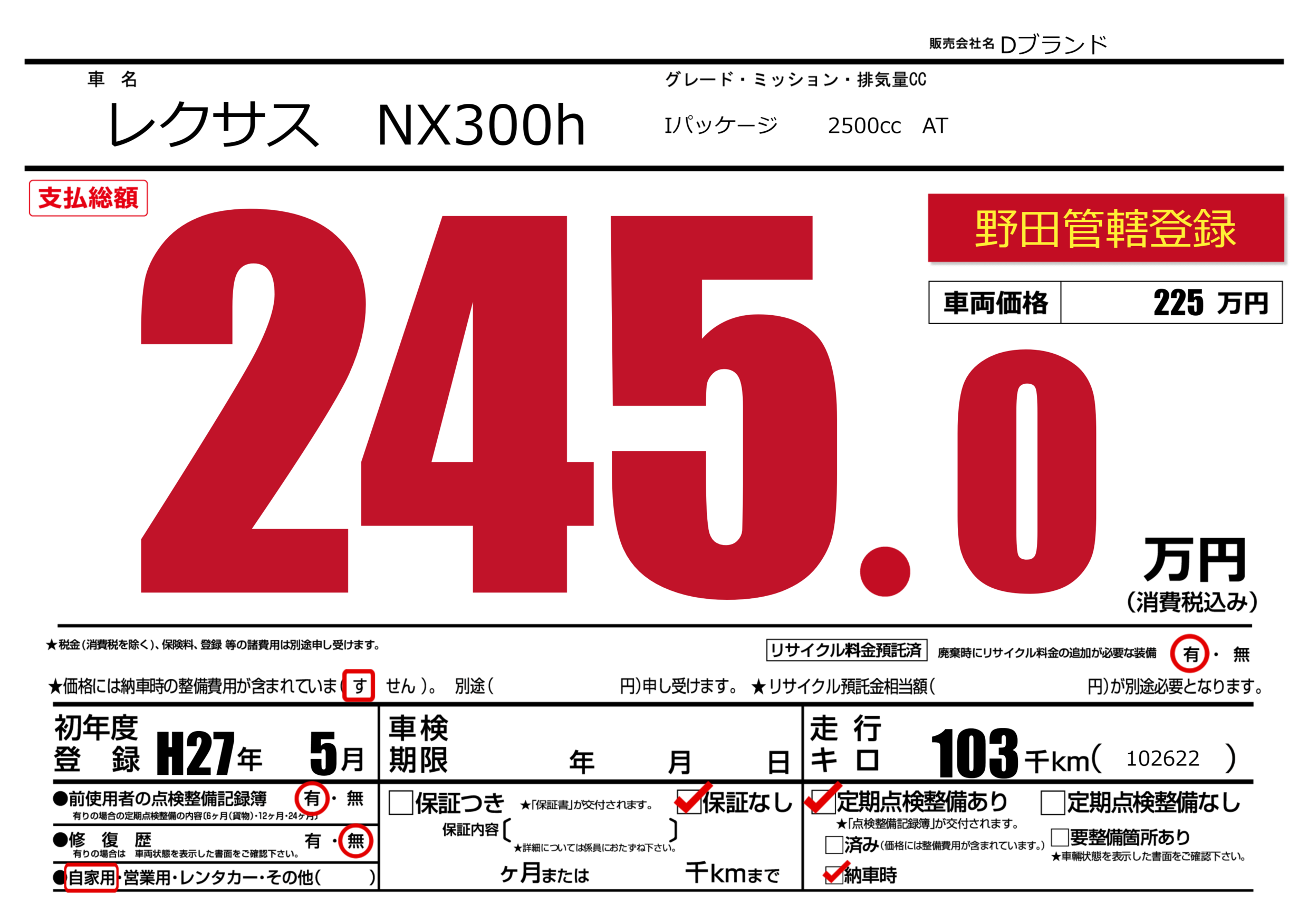 | 車名 | レクサス NX300h | グレード ミッション 排気量 |