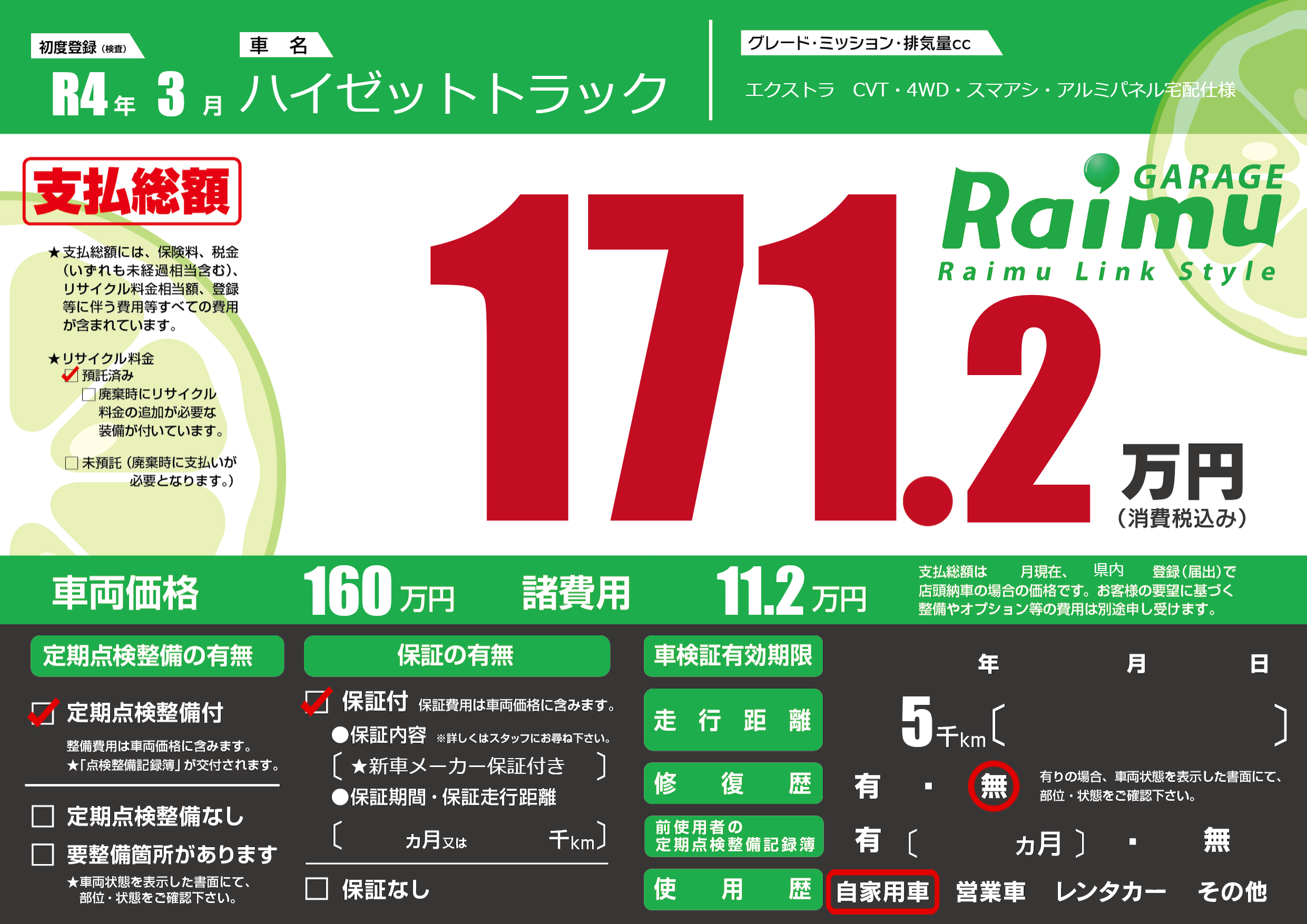保証付き 保証内容(★新車メーカー保証付き) ---ヶ月または()千kmまで |