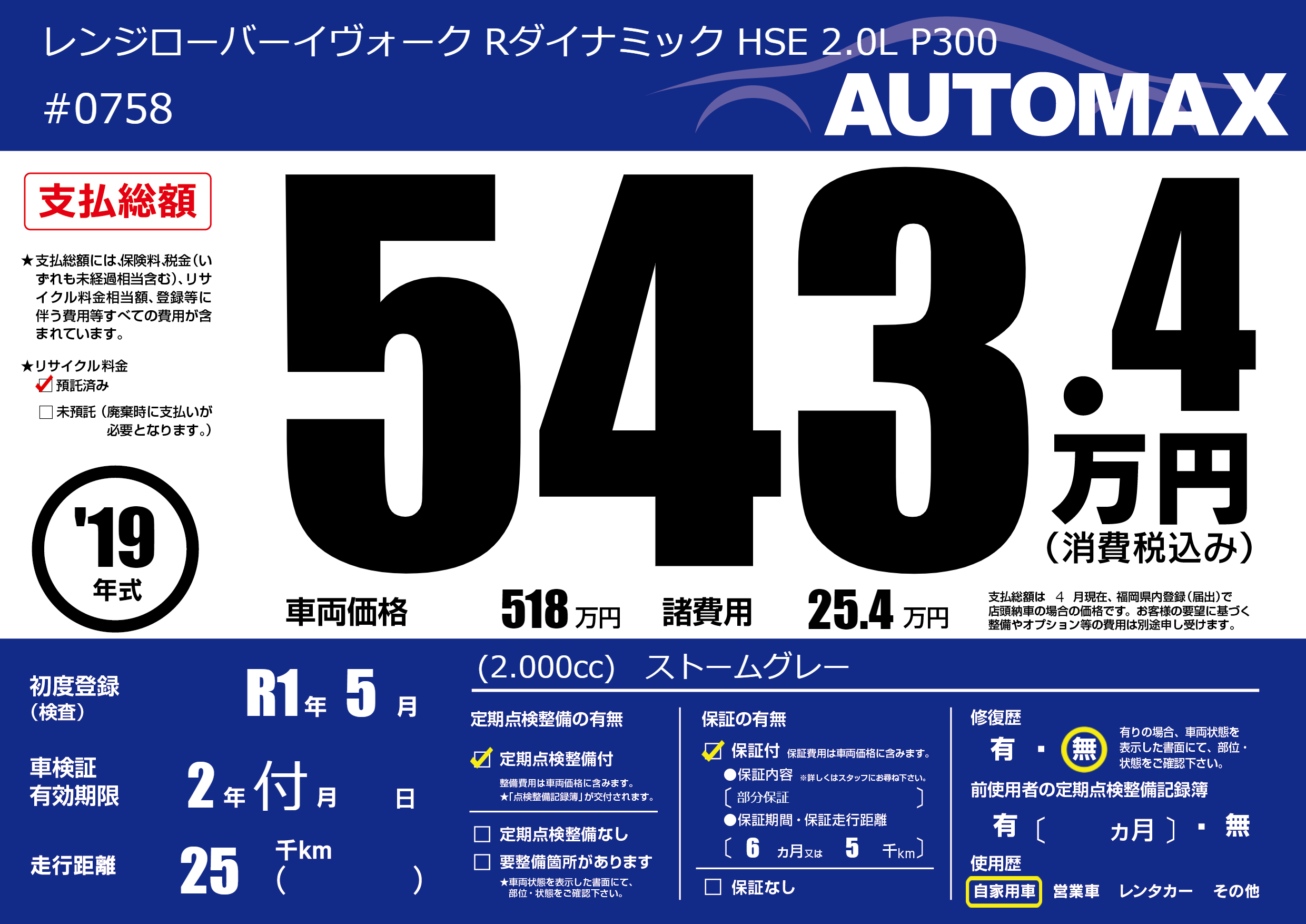 | 車名 | レンジローバーイヴォーク Rダイナミック HSE 2.0L P300 | グレード ミッション 排気量 |