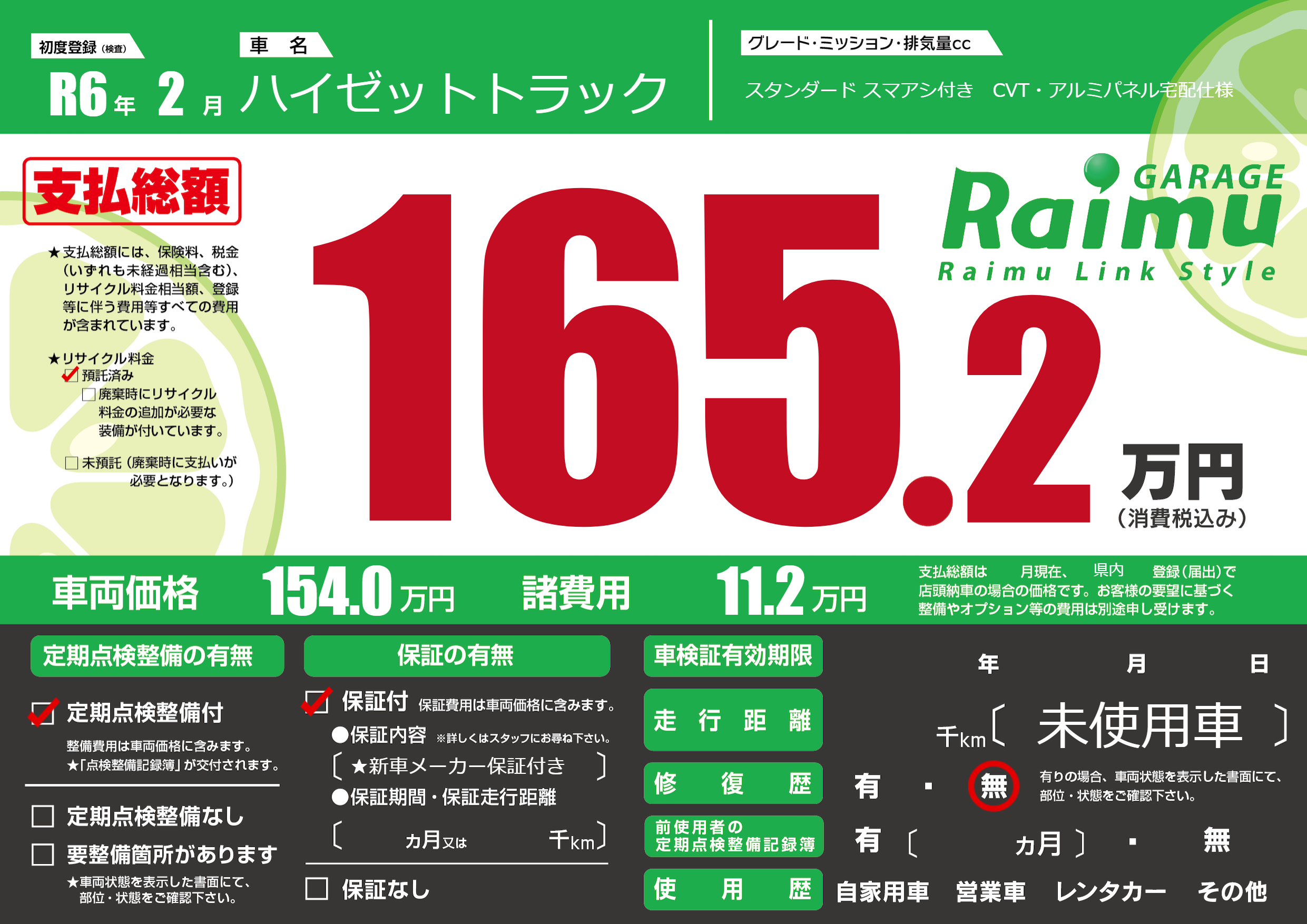 保証付き 保証内容(★新車メーカー保証付き) ---ヶ月または()千kmまで |