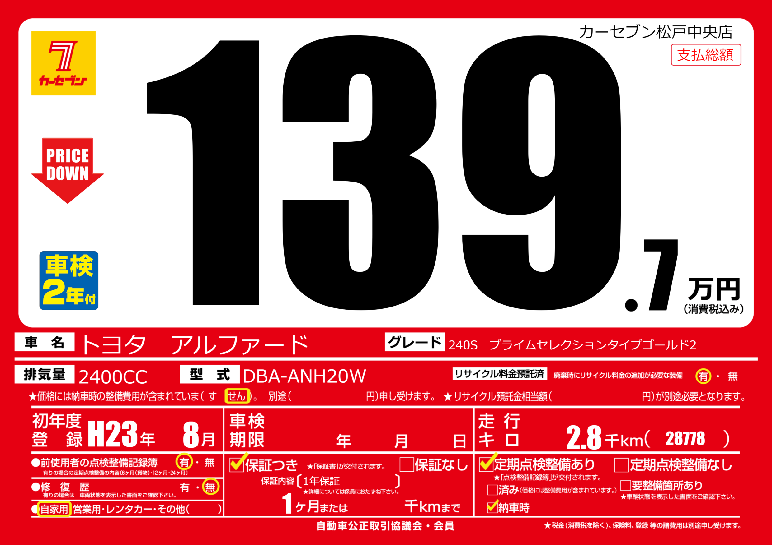 | 車名 | トヨタ アルファード | グレード ミッション 排気量 |