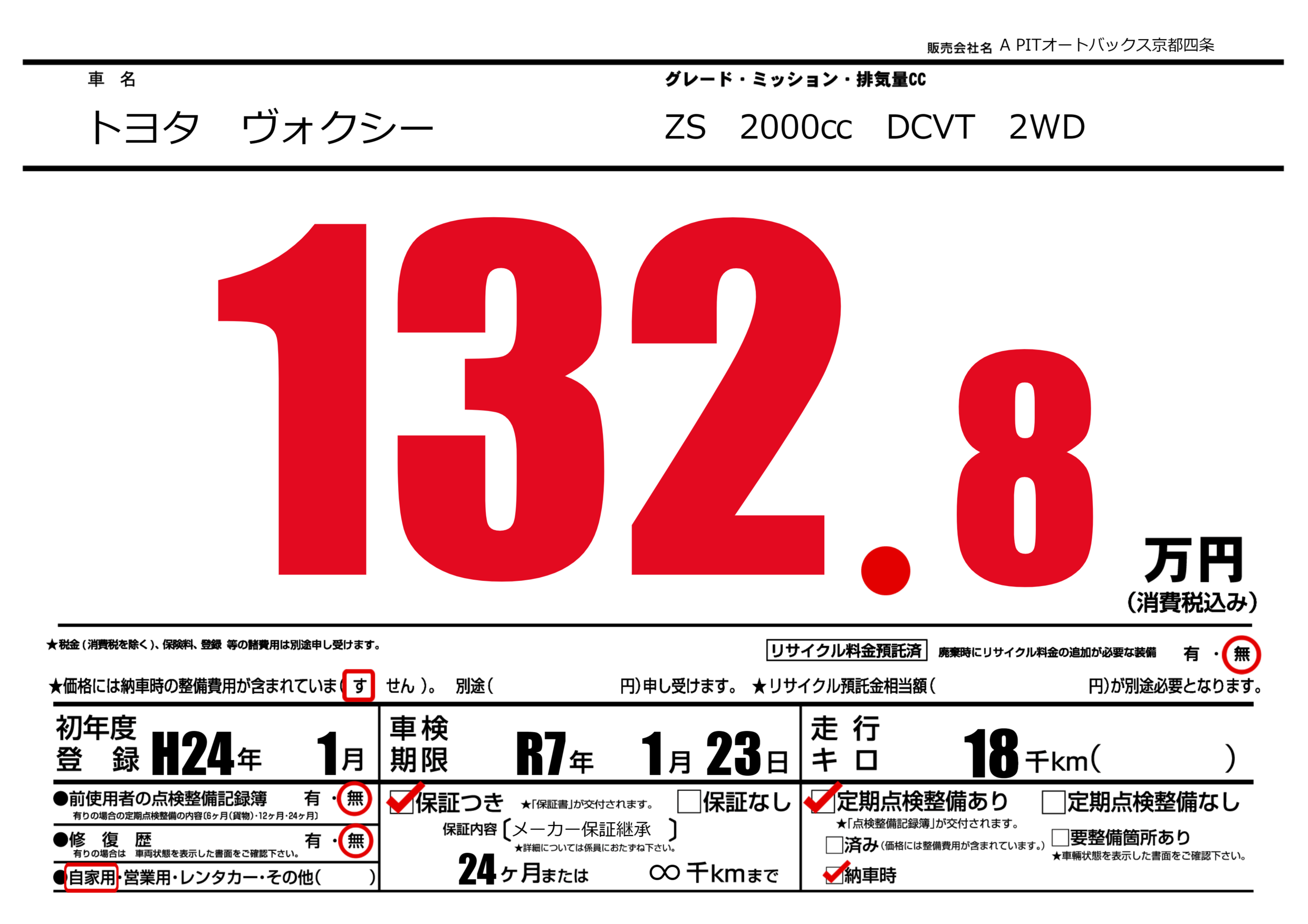 | 車名 | トヨタ ヴォクシー | グレード ミッション 排気量 |