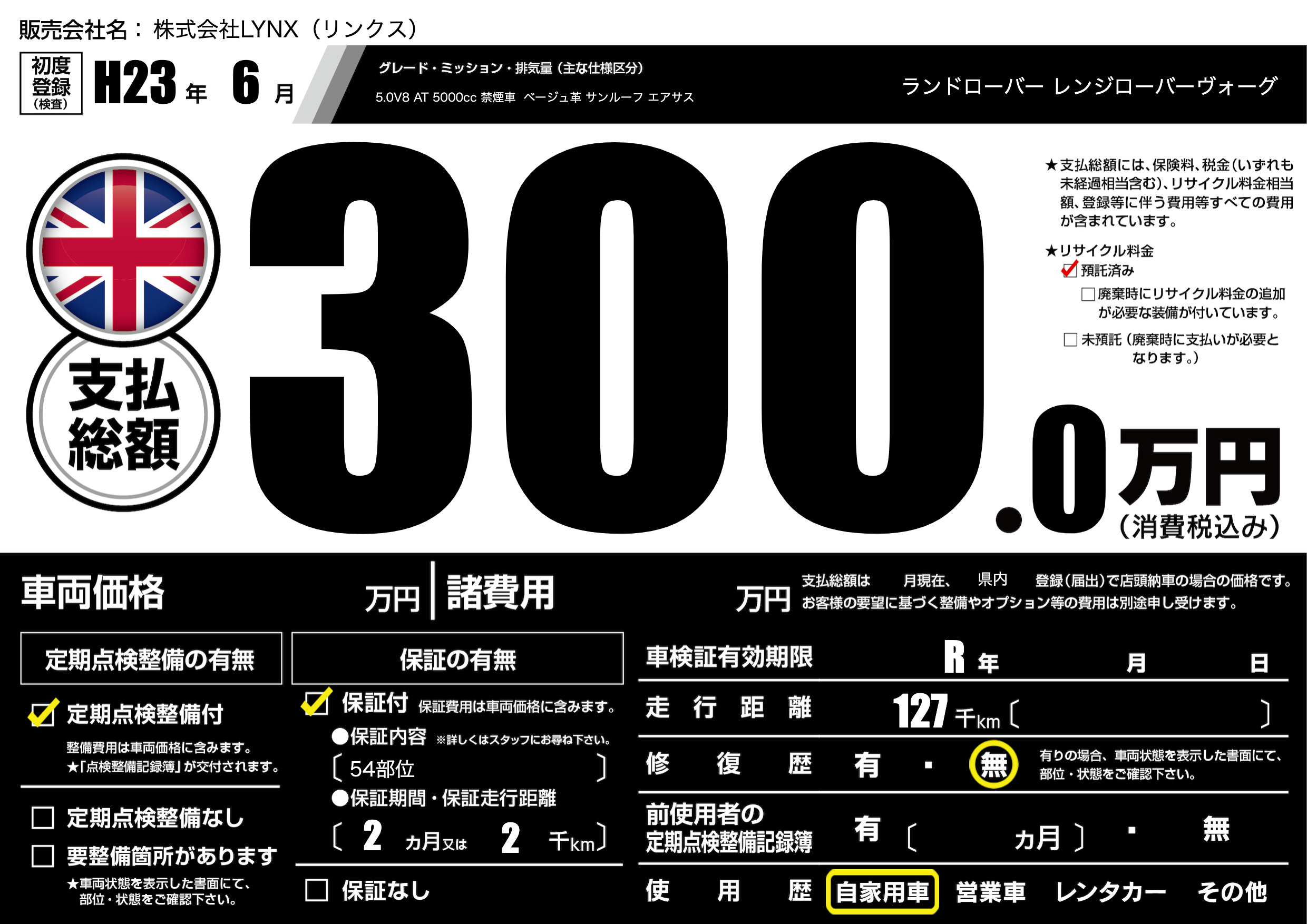 | 車名 | ランドローバー レンジローバーヴォーグ | グレード ミッション 排気量 |