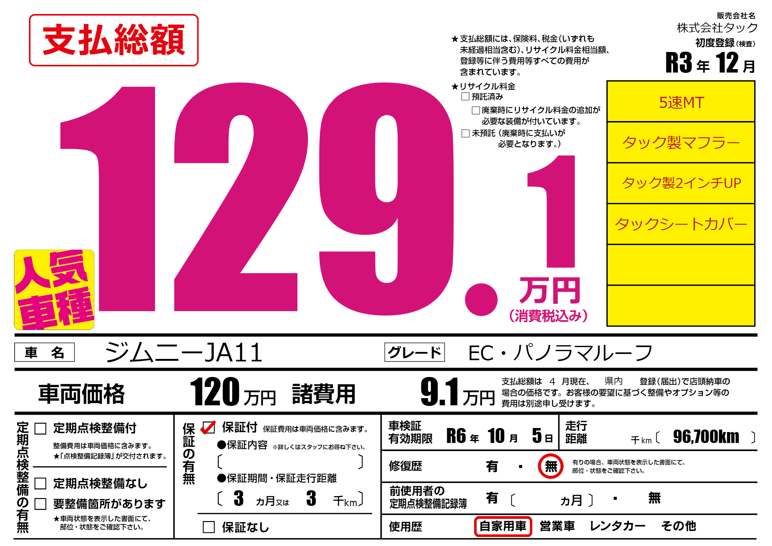 | 車名 | ジムニーJA11 | グレード ミッション 排気量 |