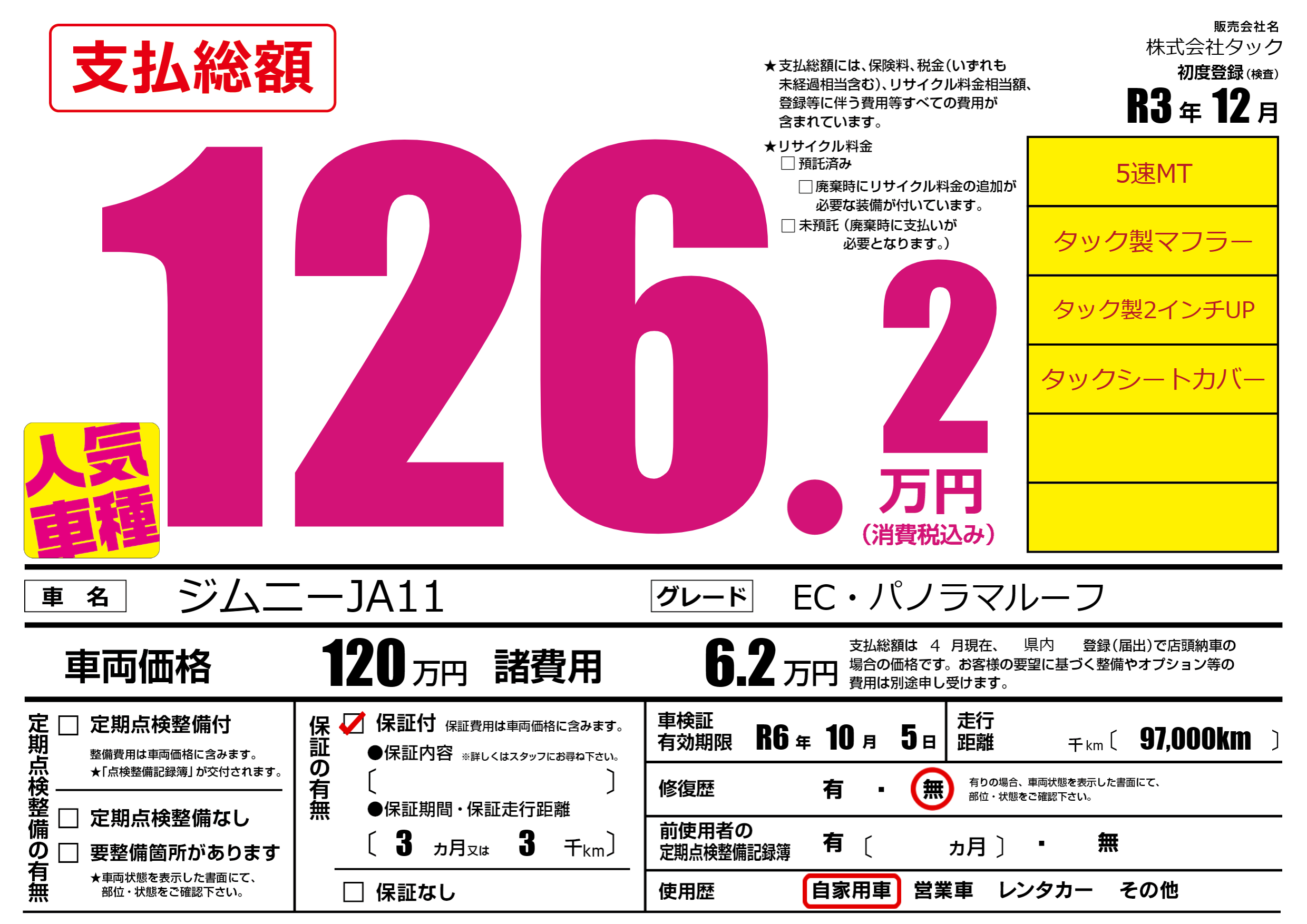 | 車名 | ジムニーJA11 | グレード ミッション 排気量 |