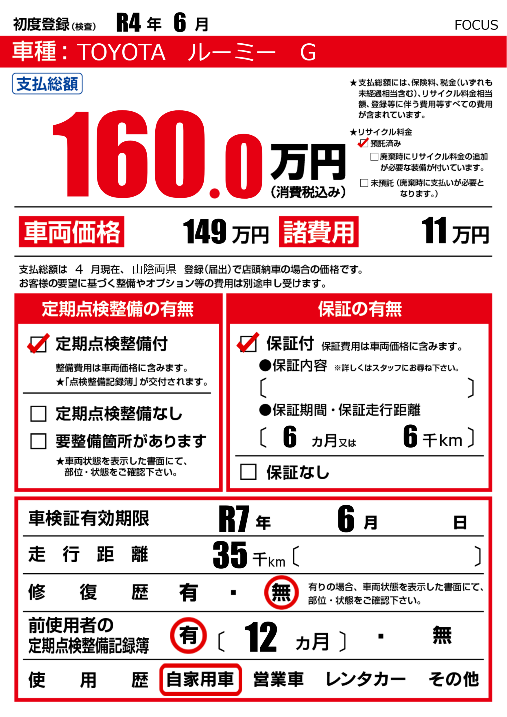 | 車名 | TOYOTA ルーミー G | グレード ミッション 排気量 |