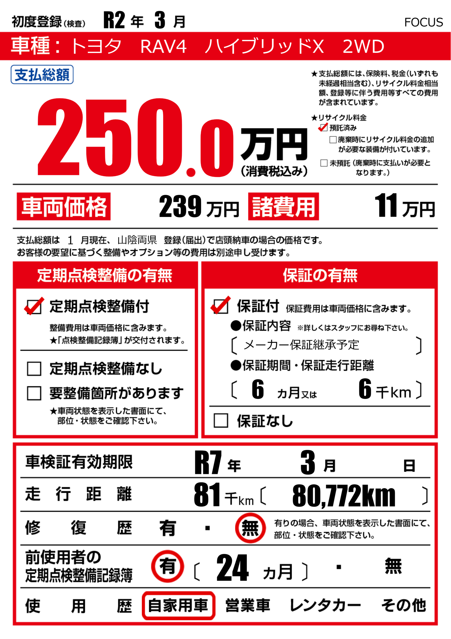 | 車検制限 | R7年 3月 - 日 | ||