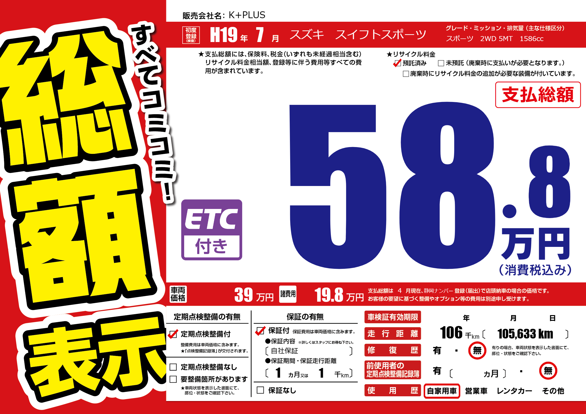 | 車名 | スズキ スイフトスポーツ | グレード ミッション 排気量 |