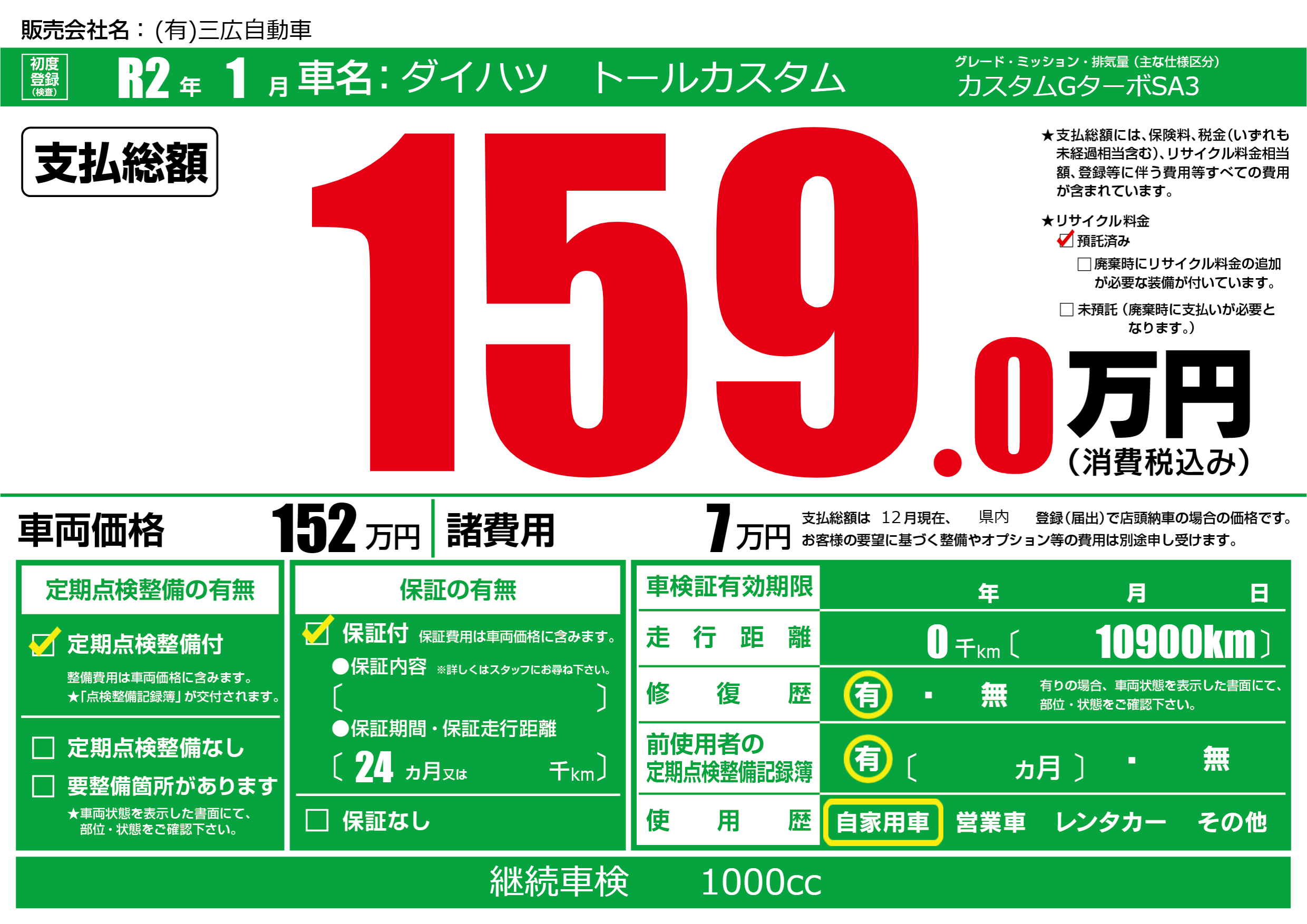 | 車名 | ダイハツ トールカスタム | グレード ミッション 排気量 |
