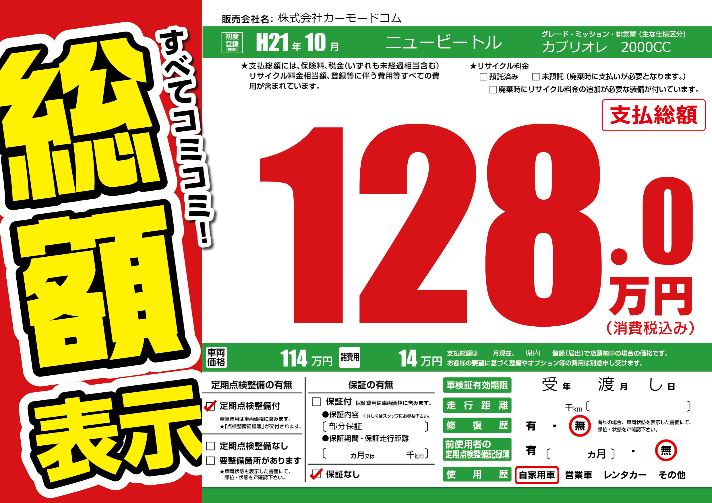 保証なし 保証内容(部分保証) ---ヶ月または()千kmまで |