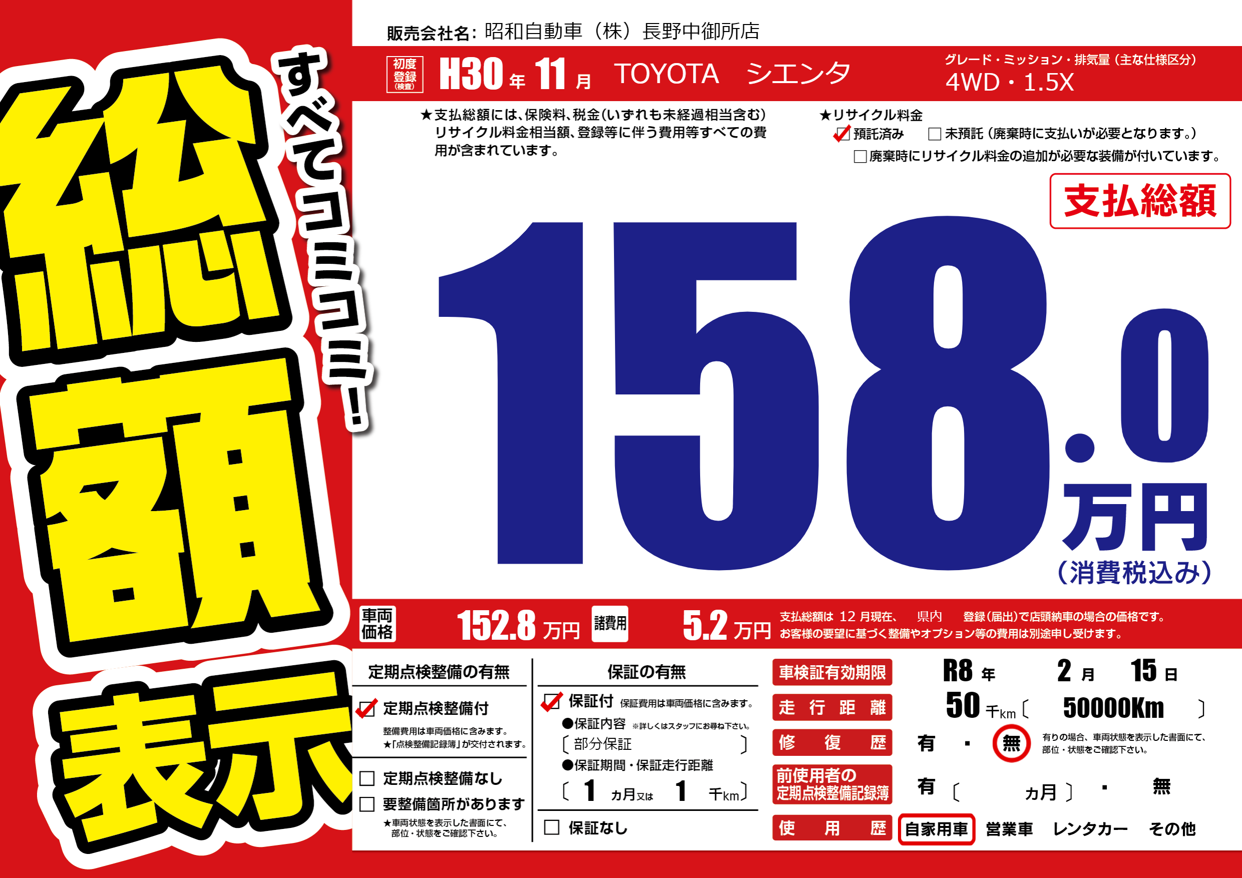 | 車名 | TOYOTA シエンタ | グレード ミッション 排気量 |