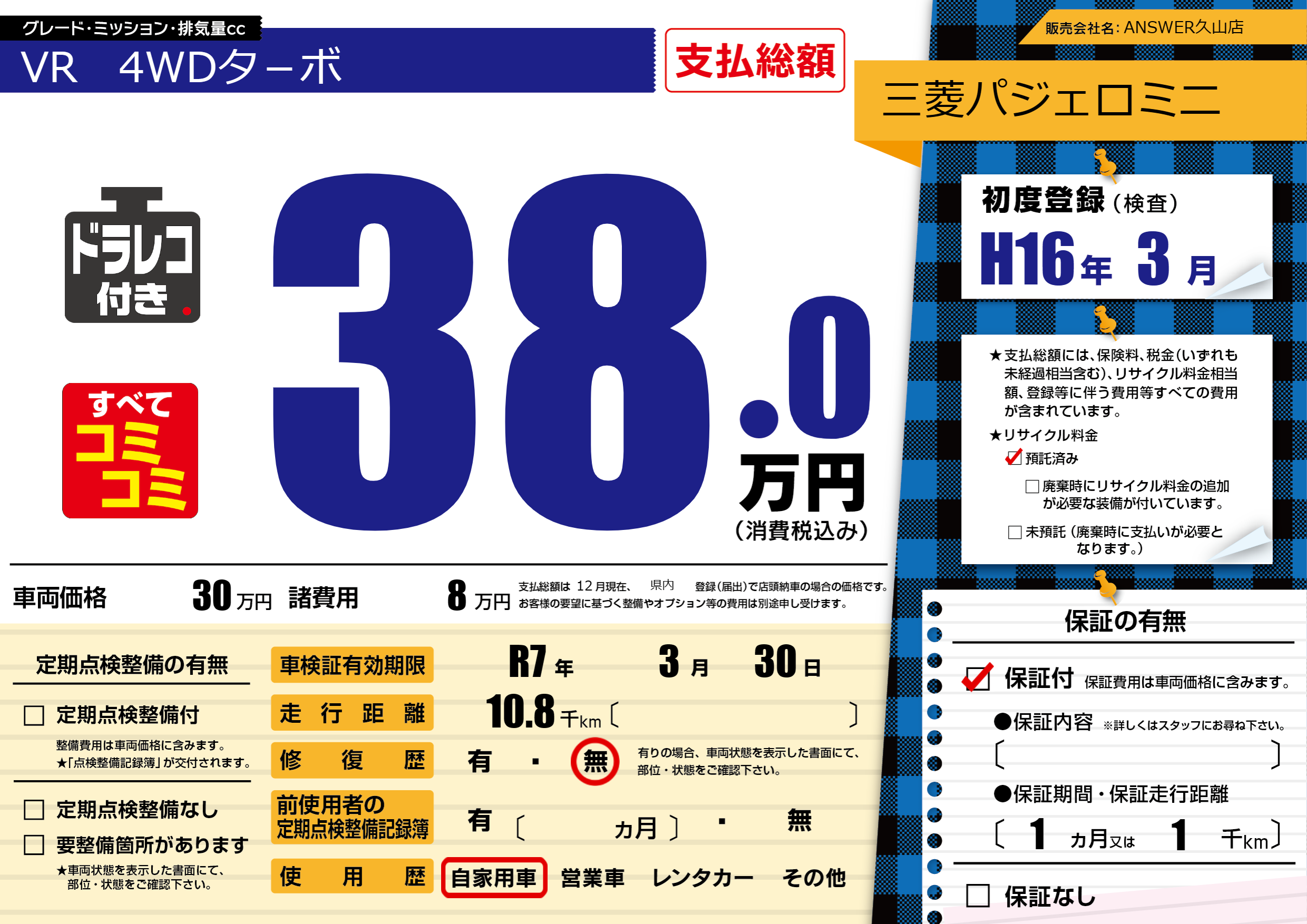 | 車名 | 三菱パジェロミニ | グレード ミッション 排気量 |