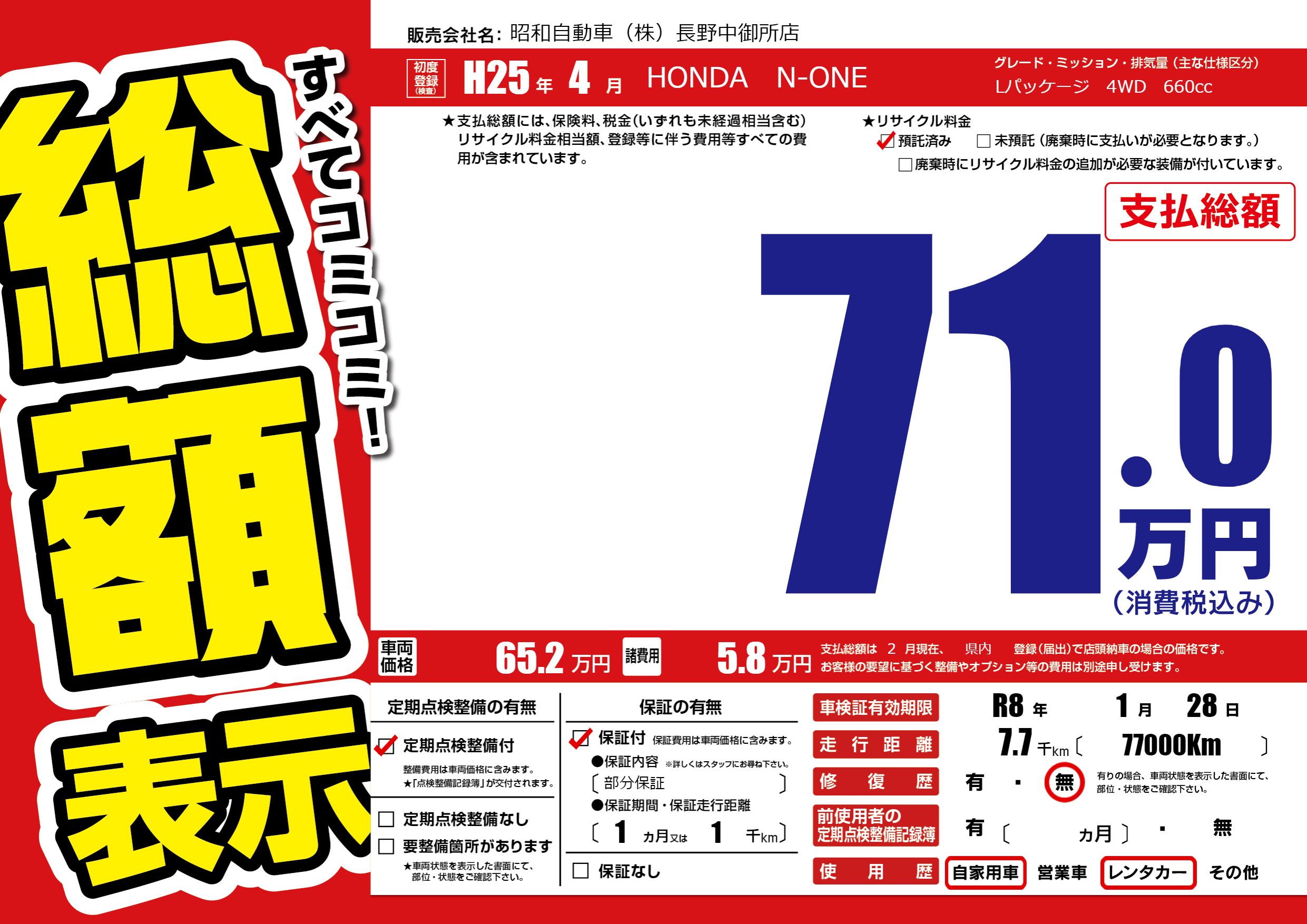 | 車名 | HONDA N-ONE | グレード ミッション 排気量 |