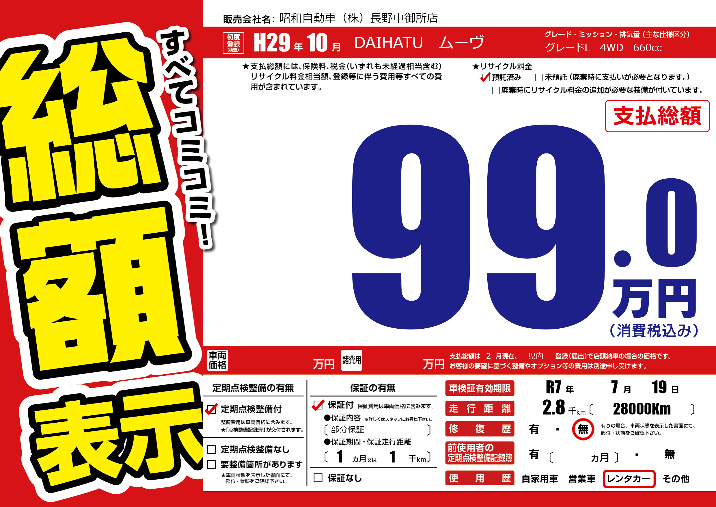 | 車名 | DAIHATU ムーヴ | グレード ミッション 排気量 |