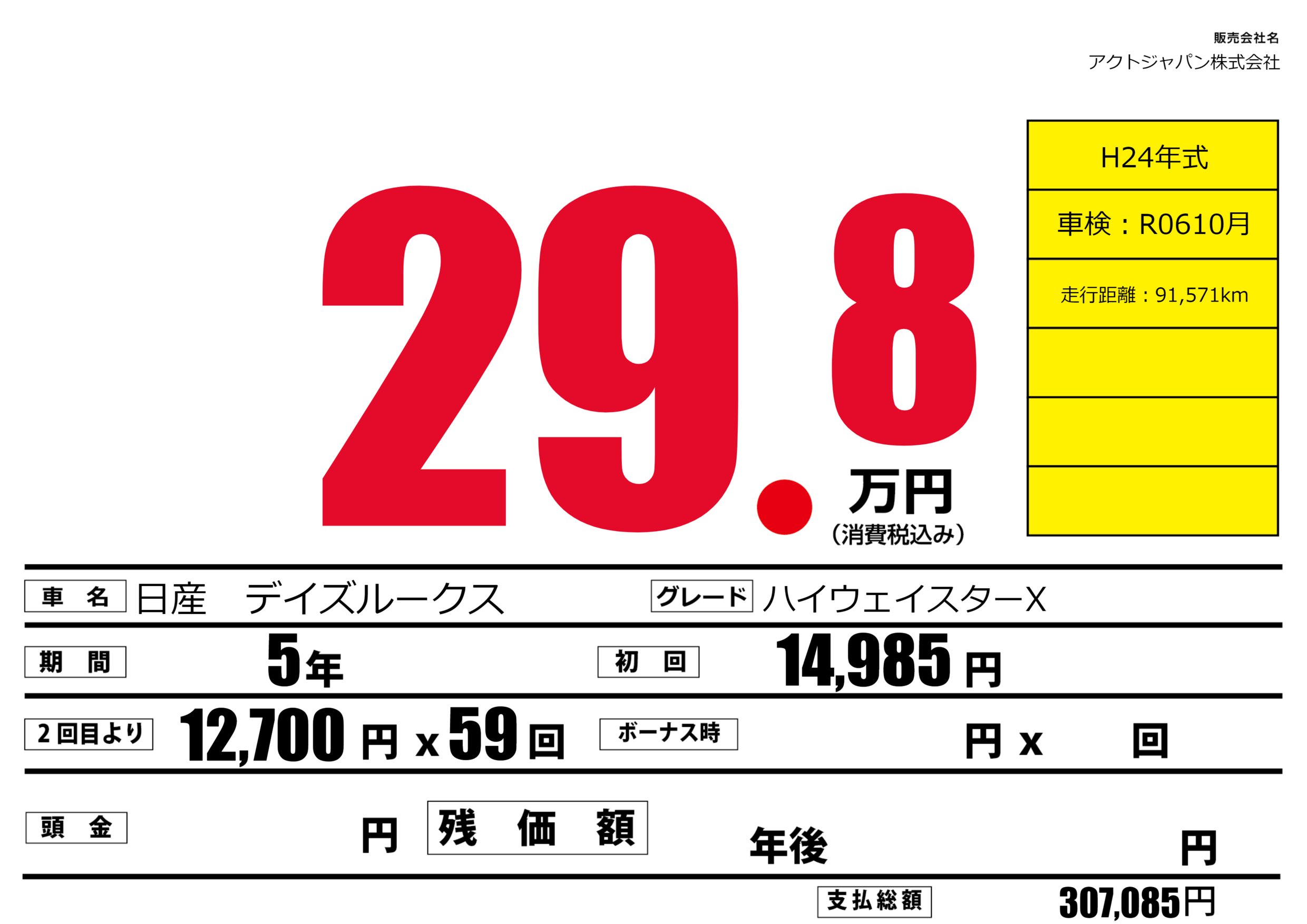 | 車名 | 日産 デイズルークス | グレード ミッション 排気量 |