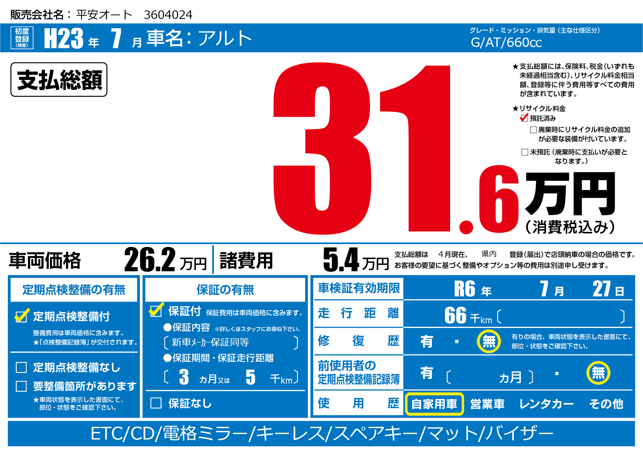 なし | 車検制限 | R6年7月27月 |
