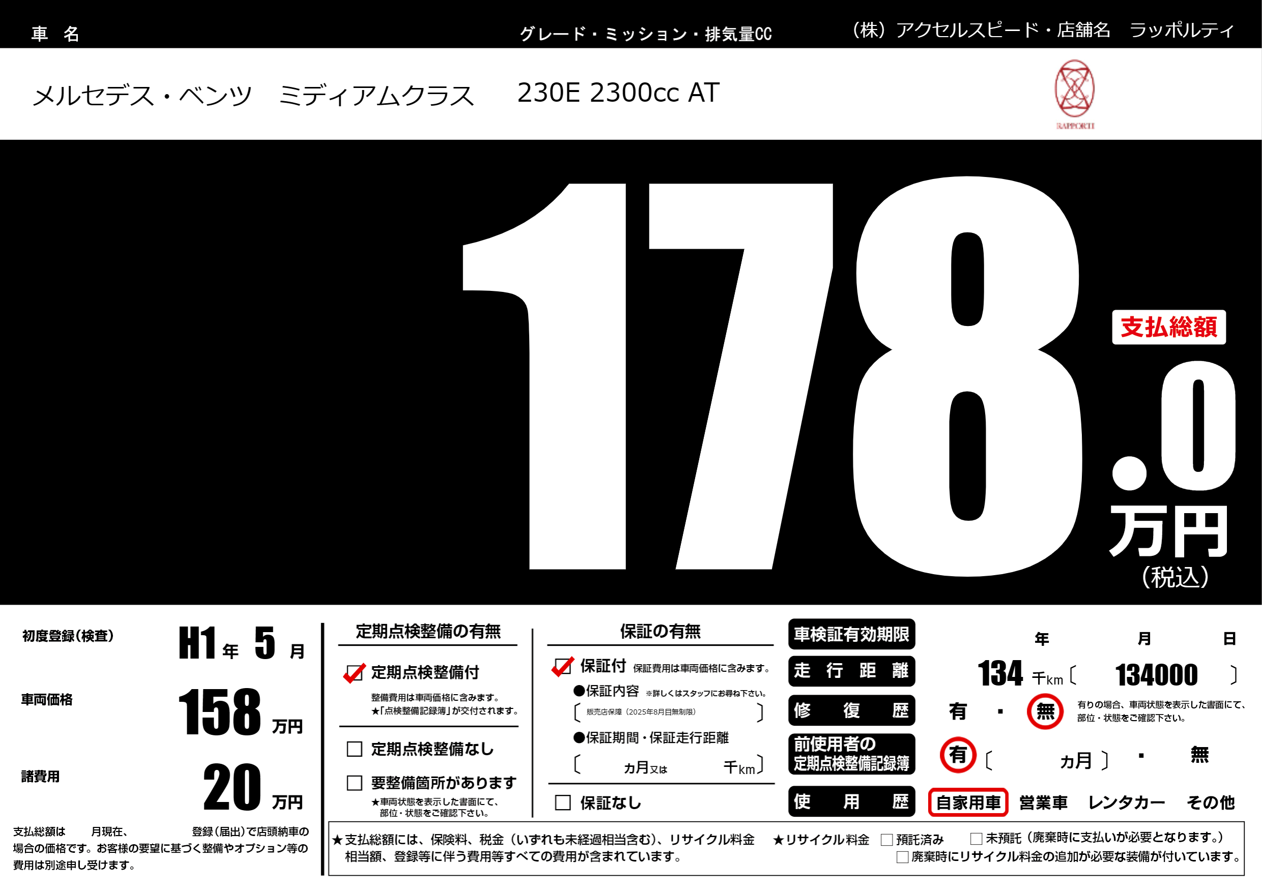 | 車名 | メルセデス・ベンツ ミディアムクラス | グレード ミッション 排気量 |