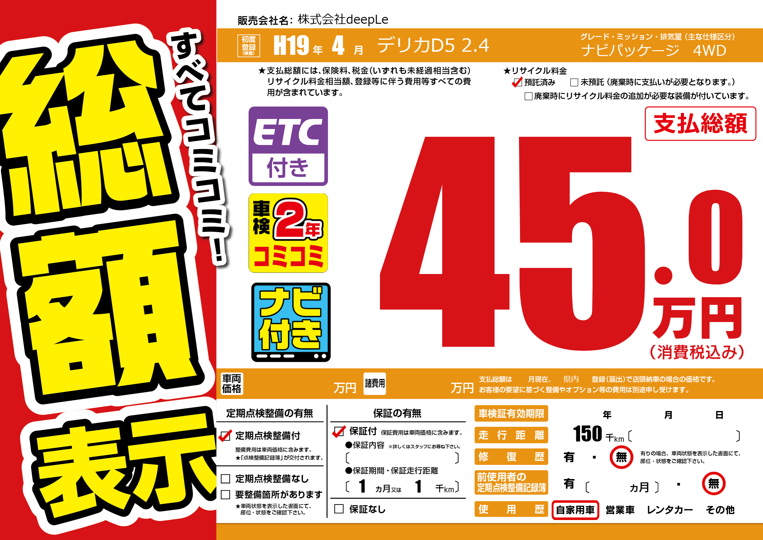 | 走行キロ | 15万km | 初年度登録 | H19年4月 |