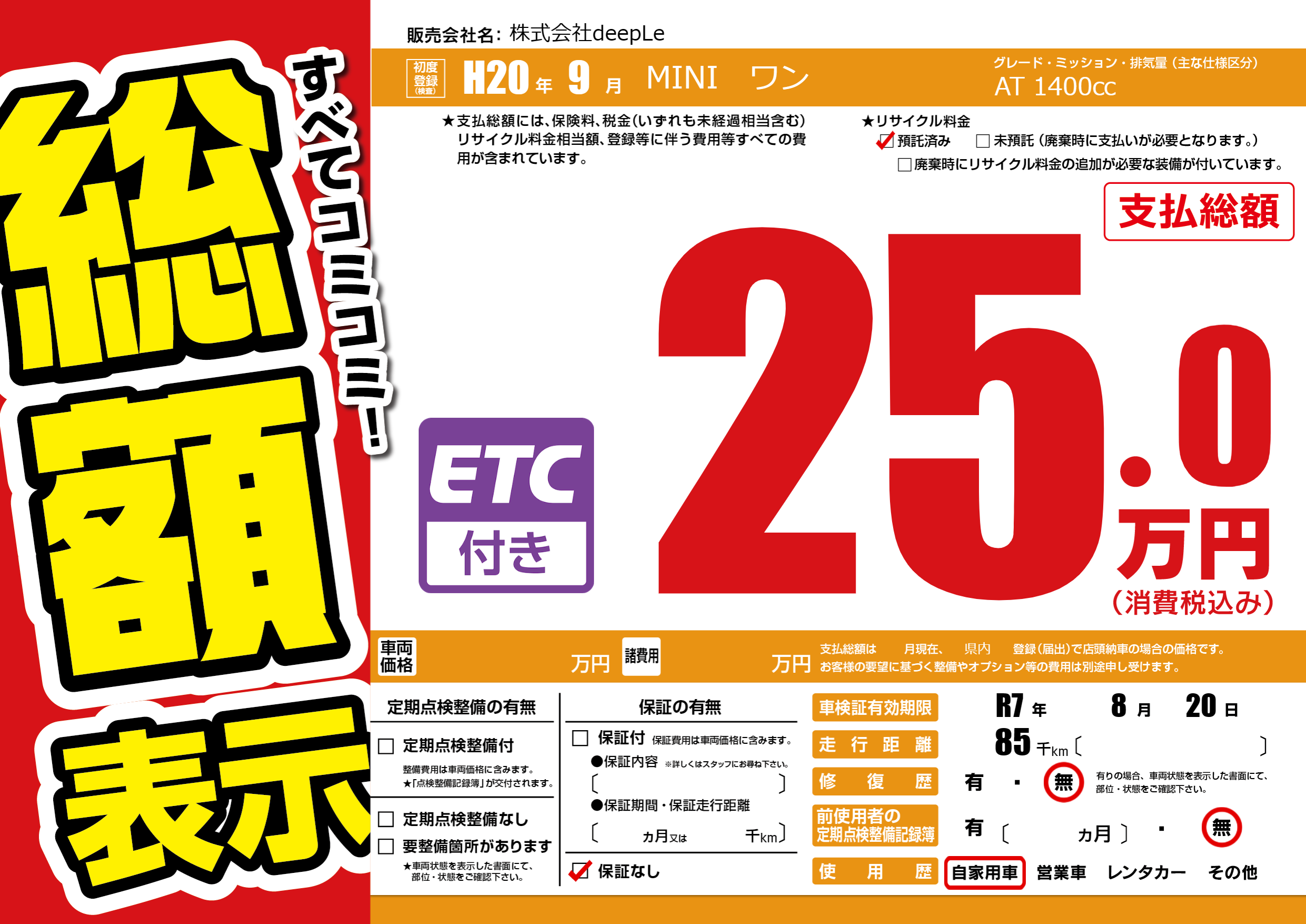 | 車検制限 | R7年 8月 20日 | ||