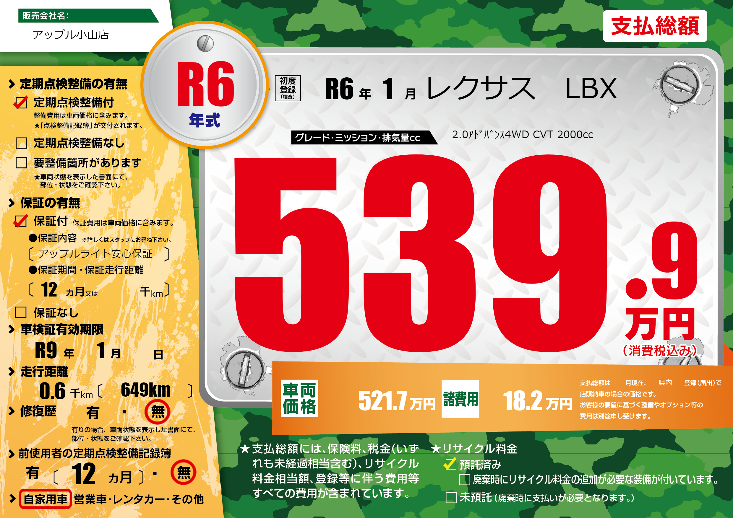 保証付き 保証内容(アップルライト安心保証) 12ヶ月または千km |