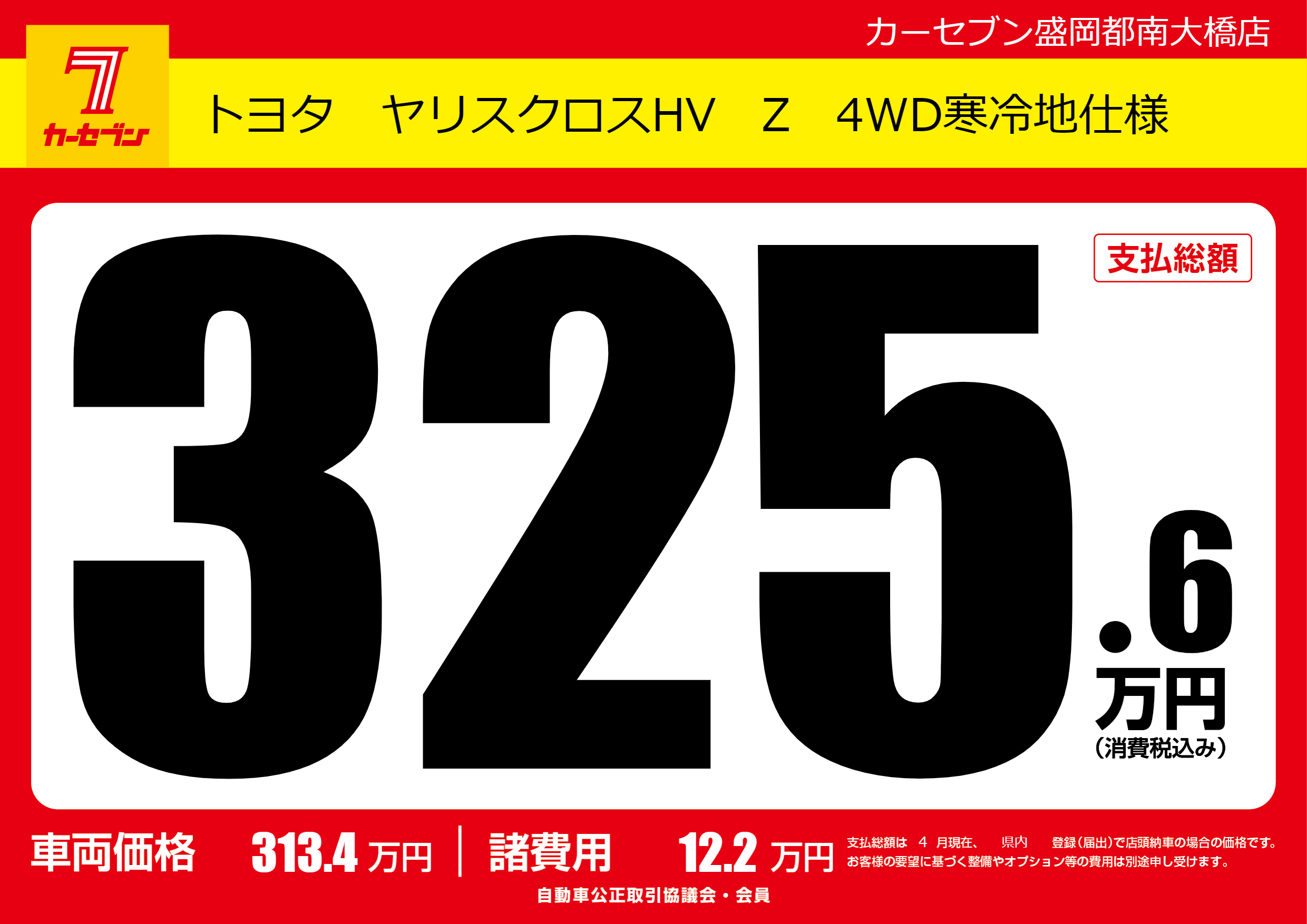 | 車名 | トヨタ ヤリスクロスHV Z 4WD寒冷地仕様 | グレード ミッション 排気量 |