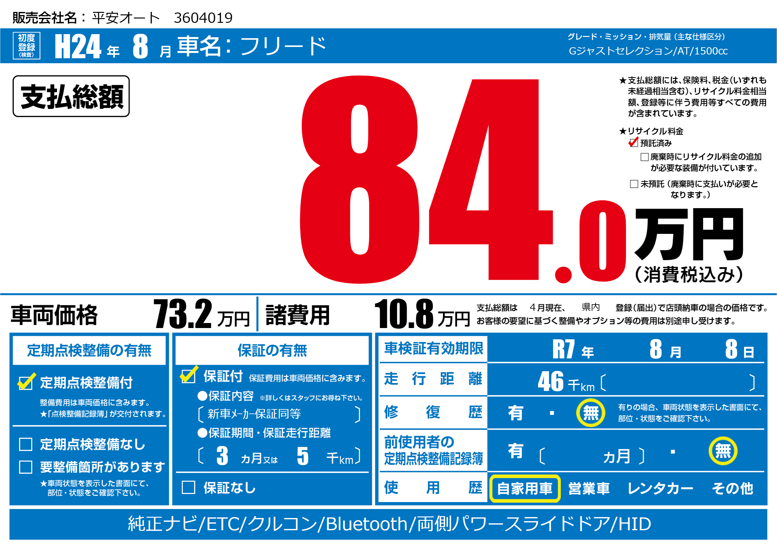 | 車検制限 | R7年 8月 8日 | ||