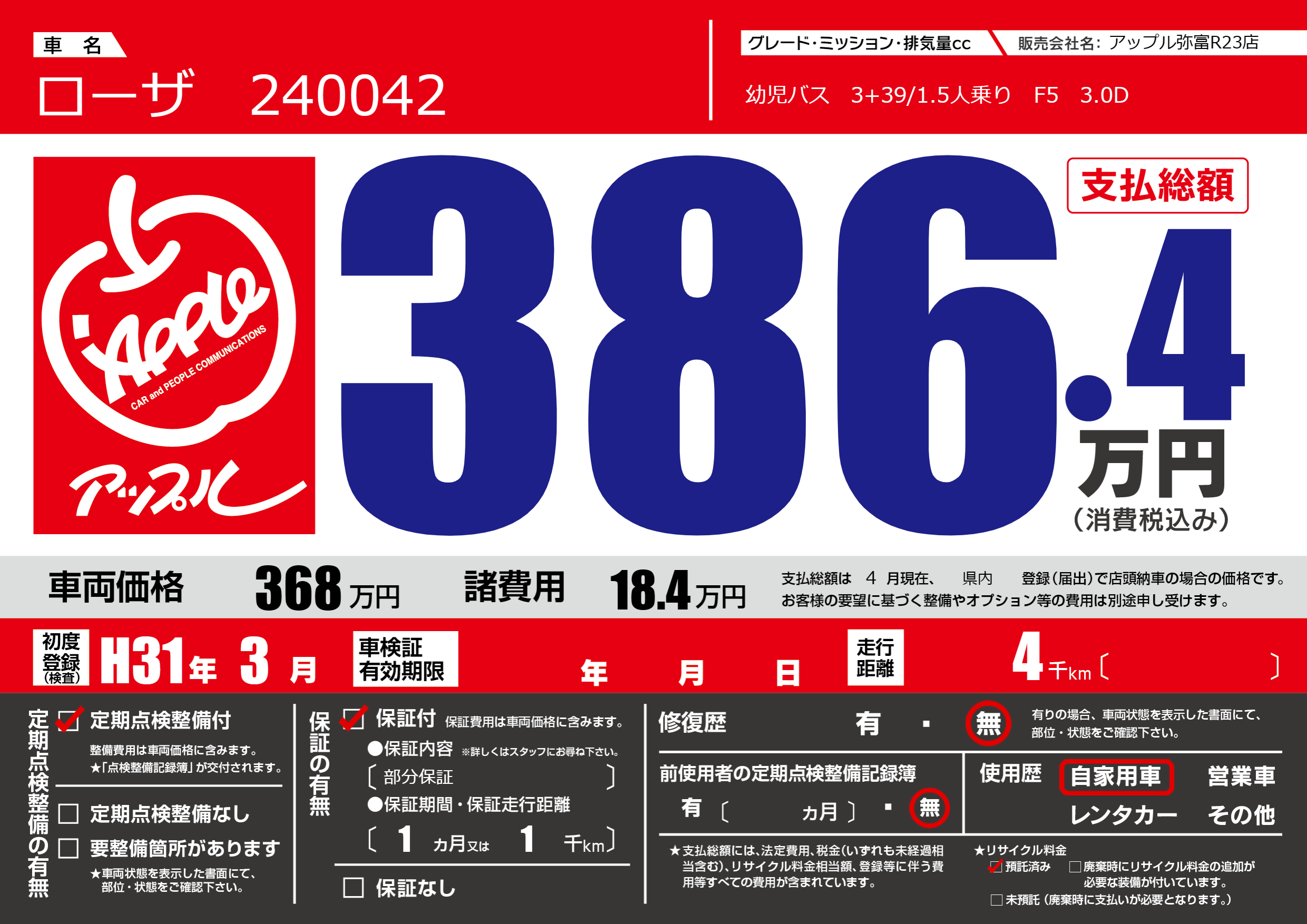 | 車名 | ローザ 240042 | グレード ミッション 排気量 |