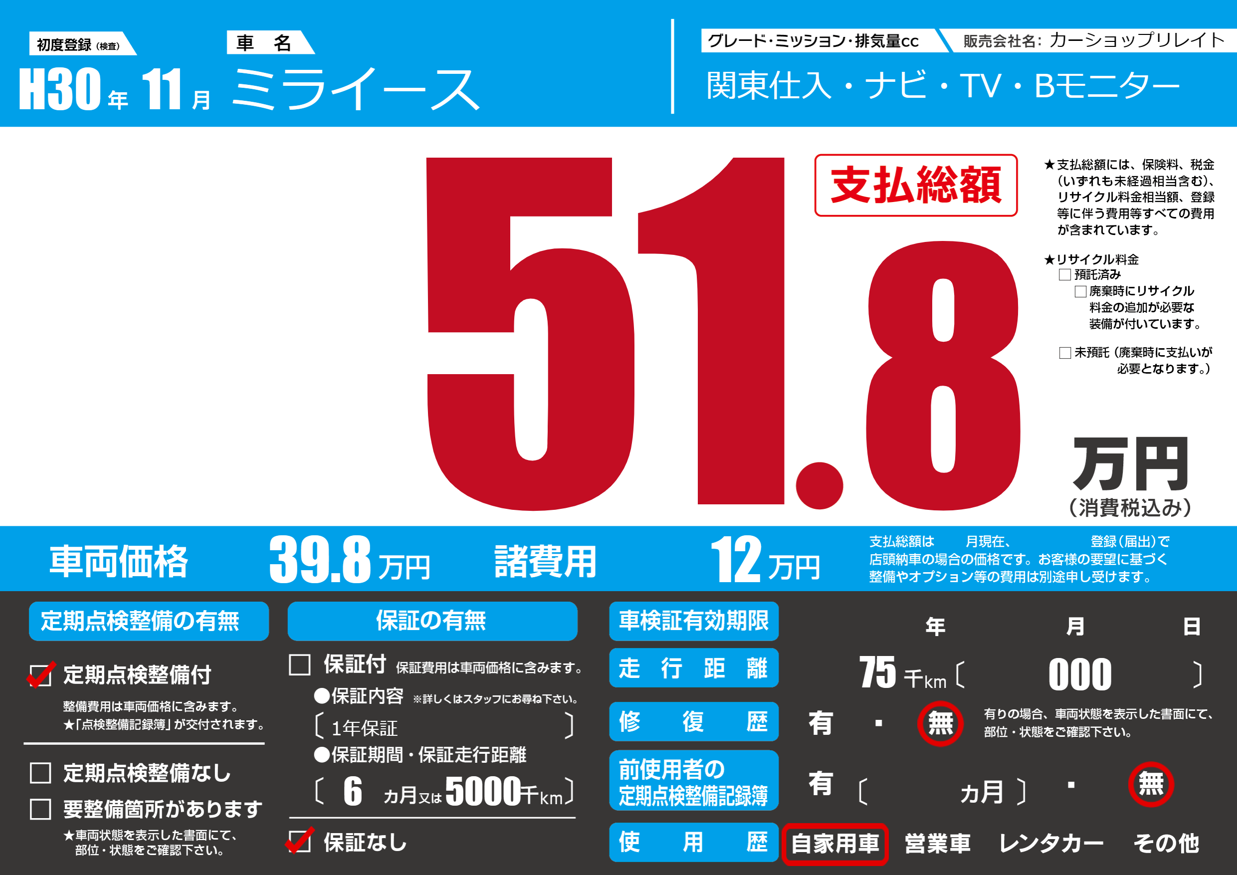 | 車名 | ミライース | グレード ミッション 排気量 |