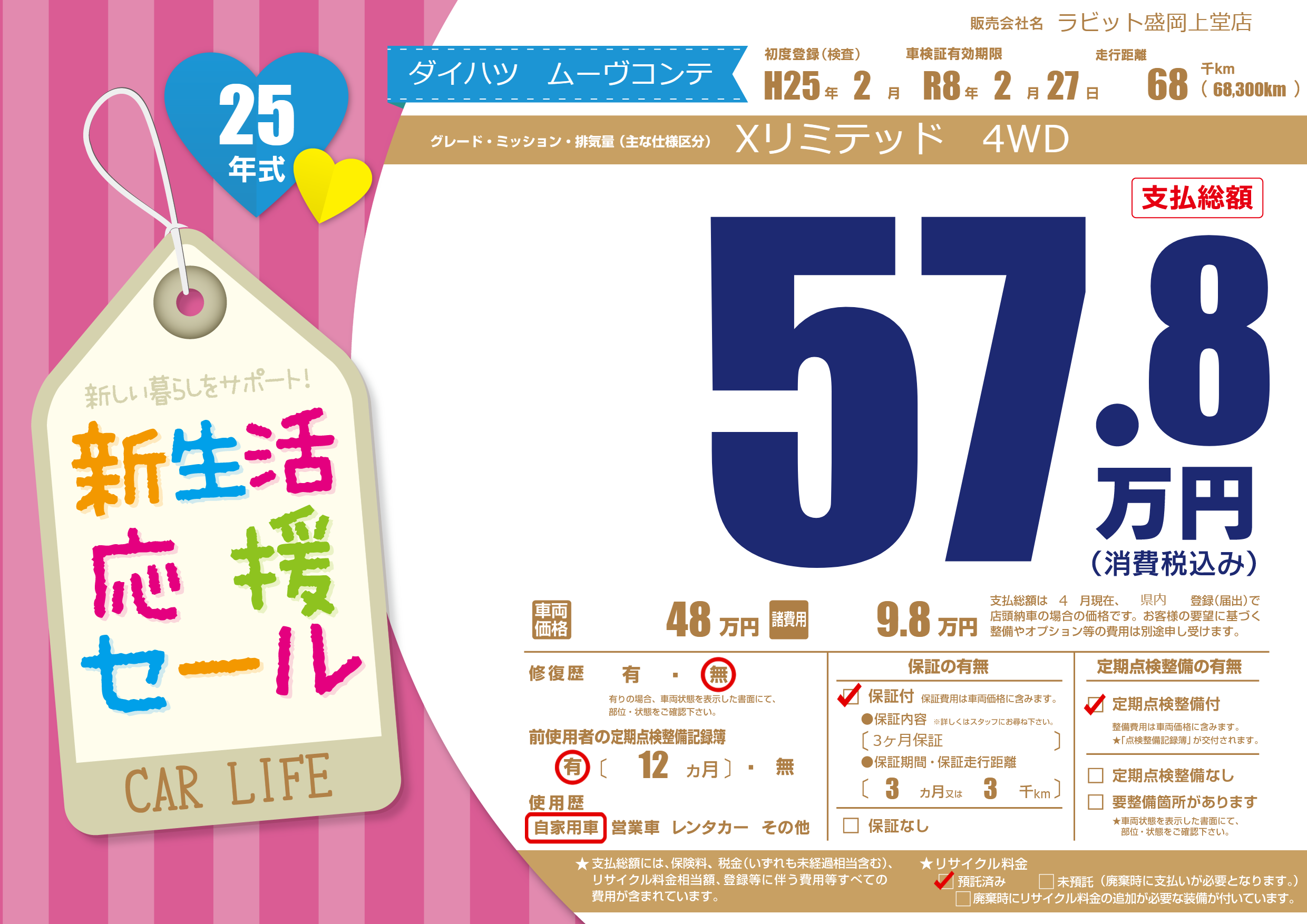 | 走行キロ | 6.8万km | 初年度登録 | H25年2月 |