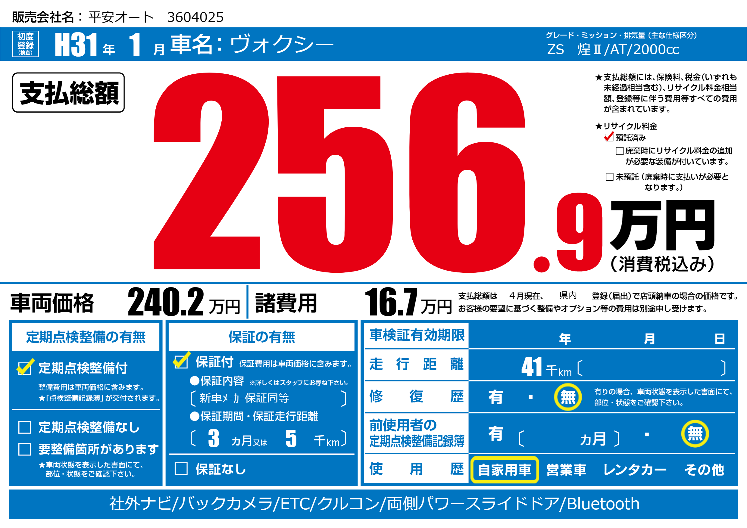 | 車名 | ヴォクシー | グレード ミッション 排気量 |