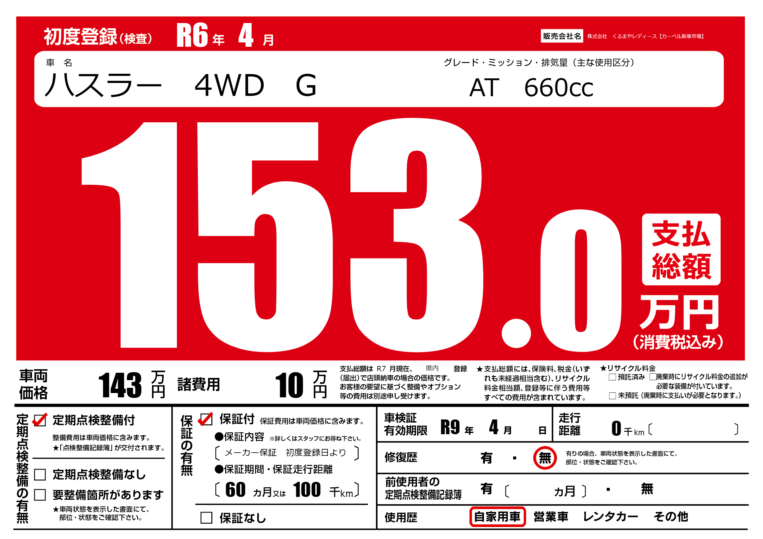 | 車名 | ハスラー 4WD G | グレード ミッション 排気量 |