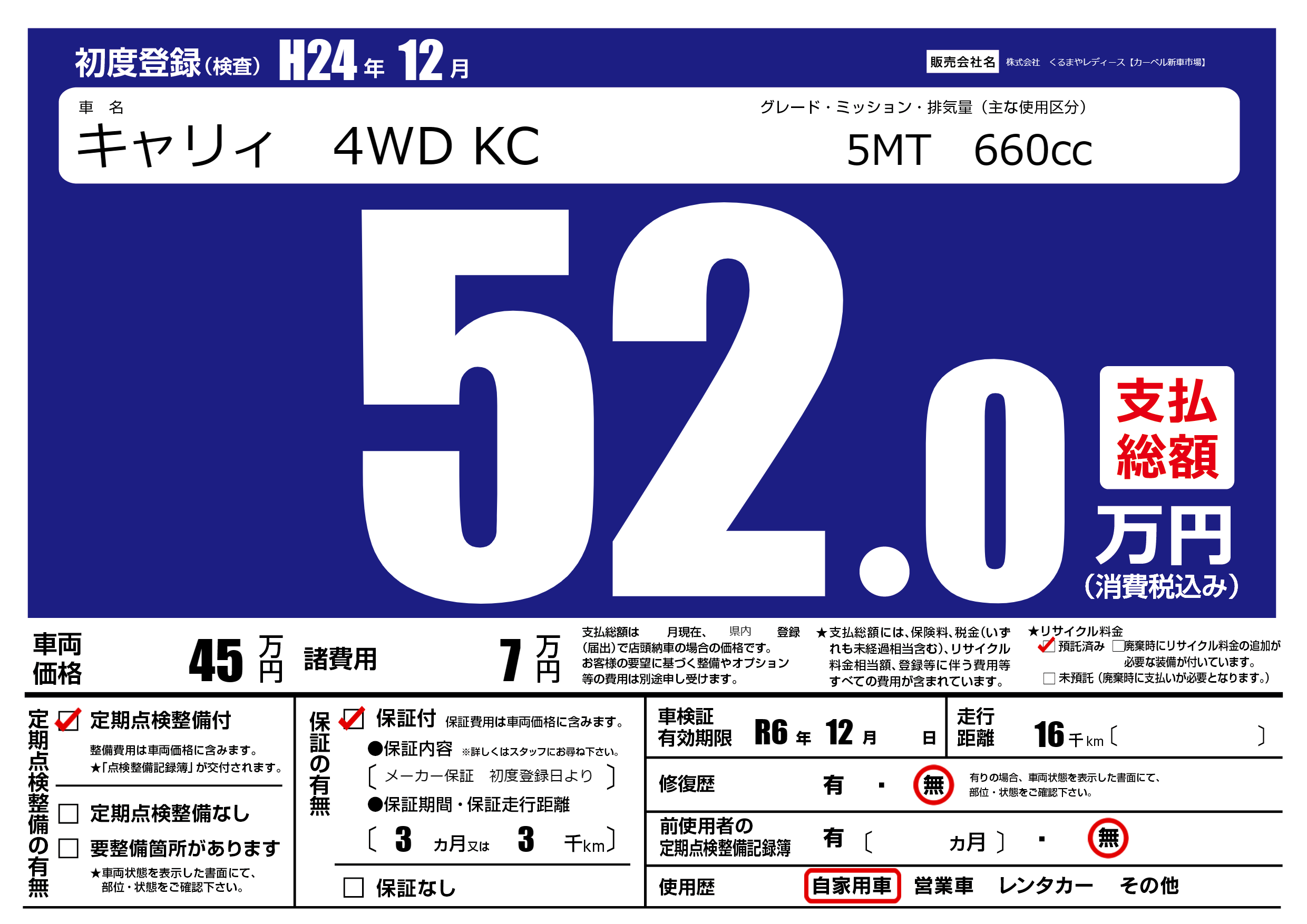 | 車名 | キャリィ 4WD KC | グレード ミッション 排気量 |