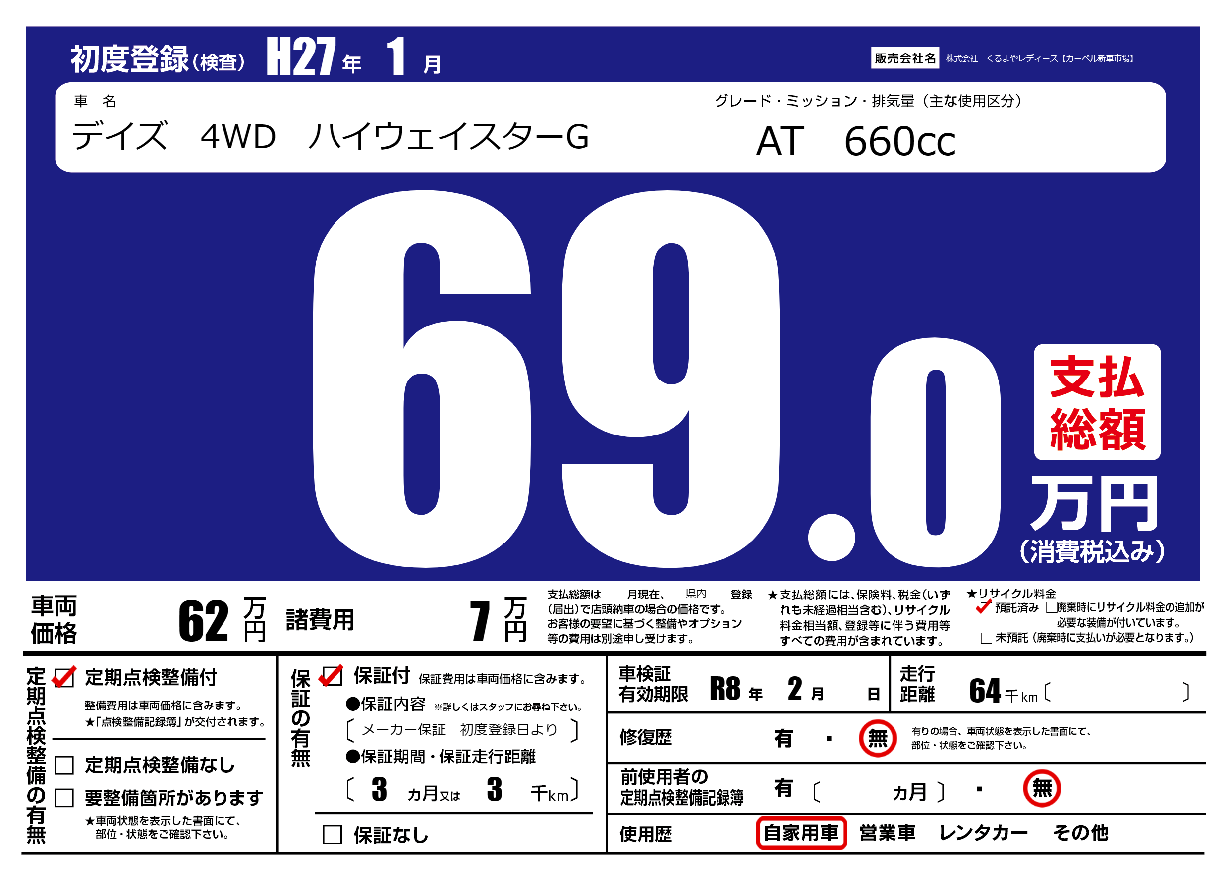 | 走行キロ | 6.4万km | 初年度登録 | H27年1月 |