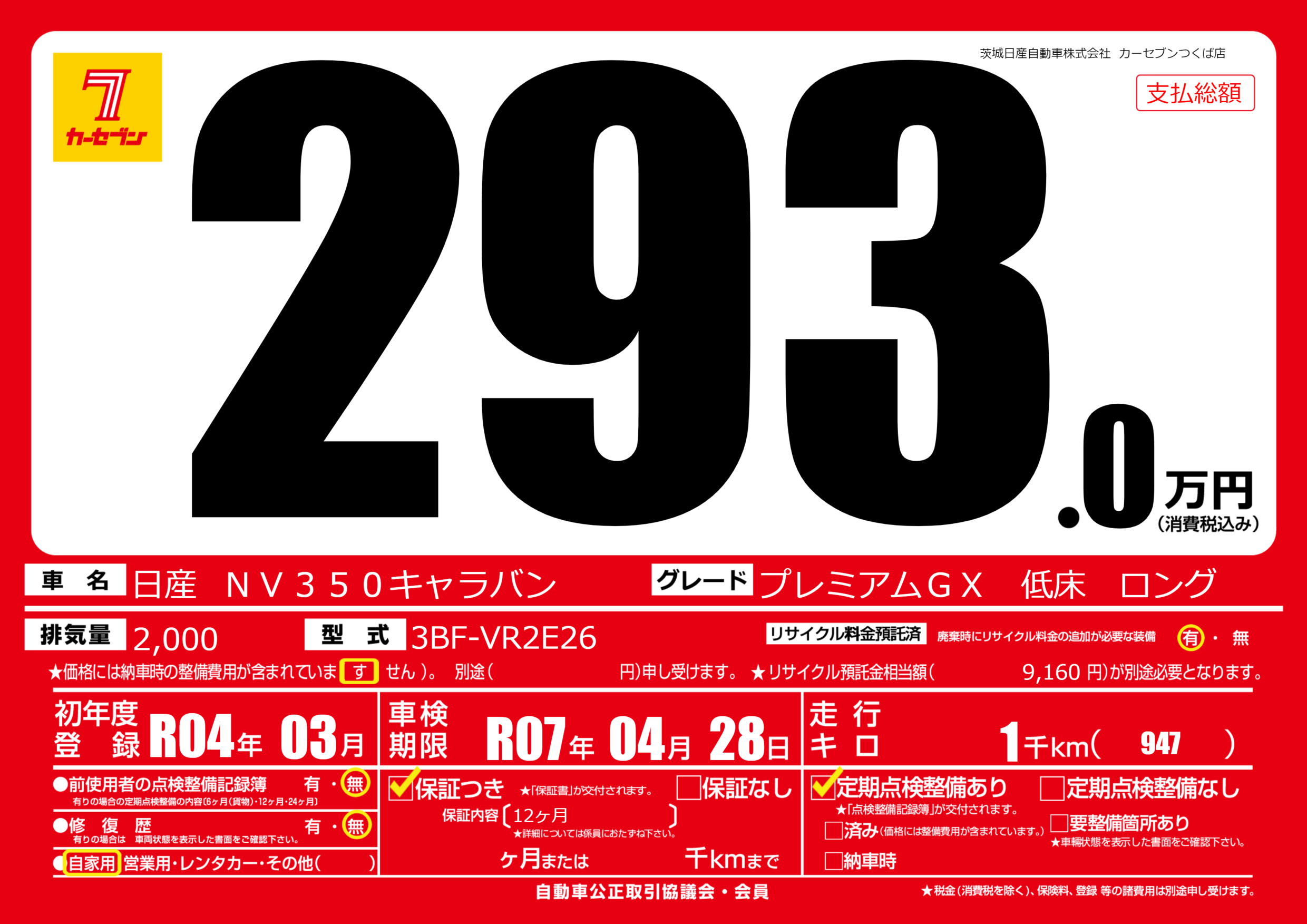 | 車名 | 日産 NV350キャラバン | グレード ミッション 排気量 |