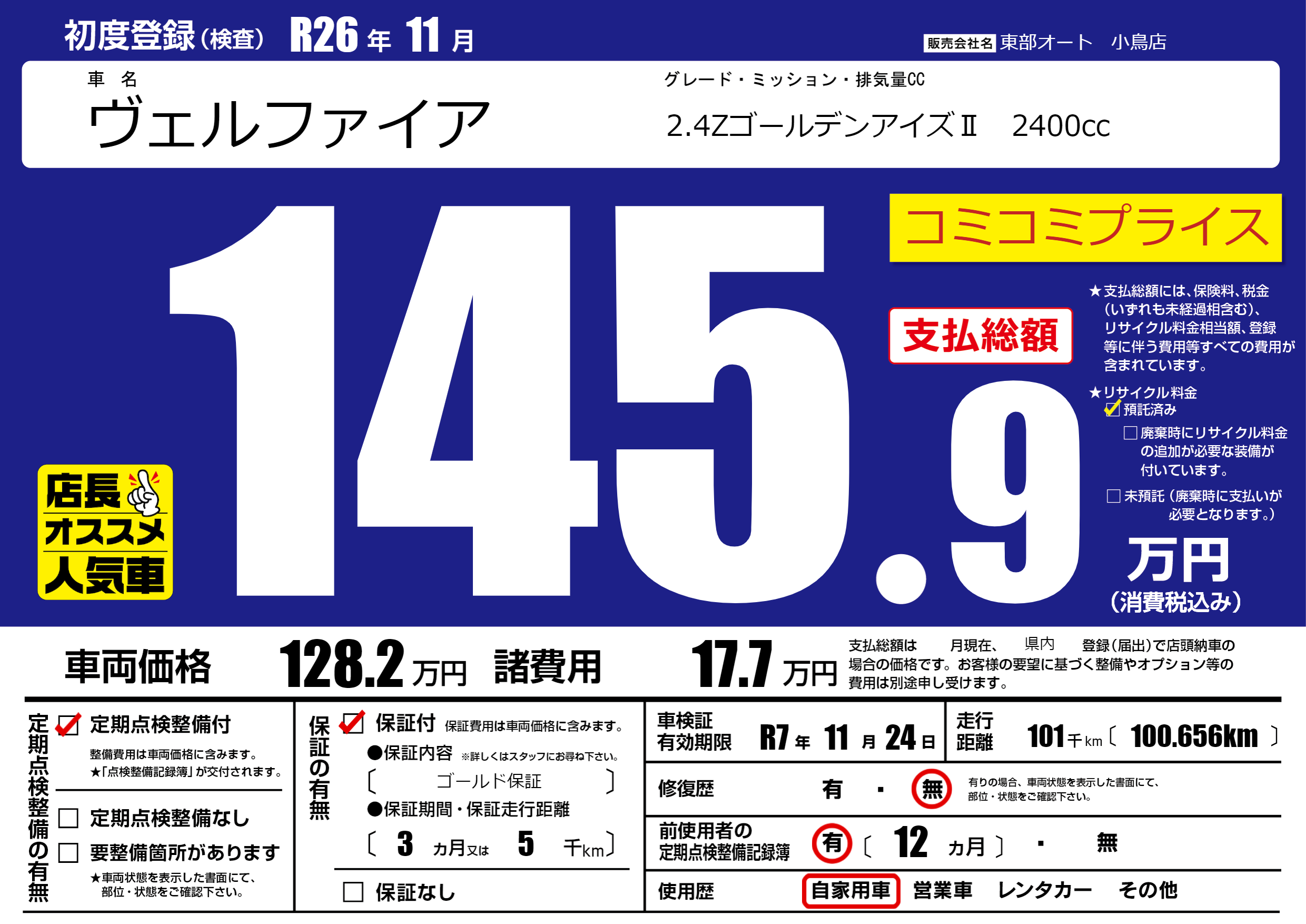 保証付き 保証内容( ゴールド保証) 3ヶ月または5千km |