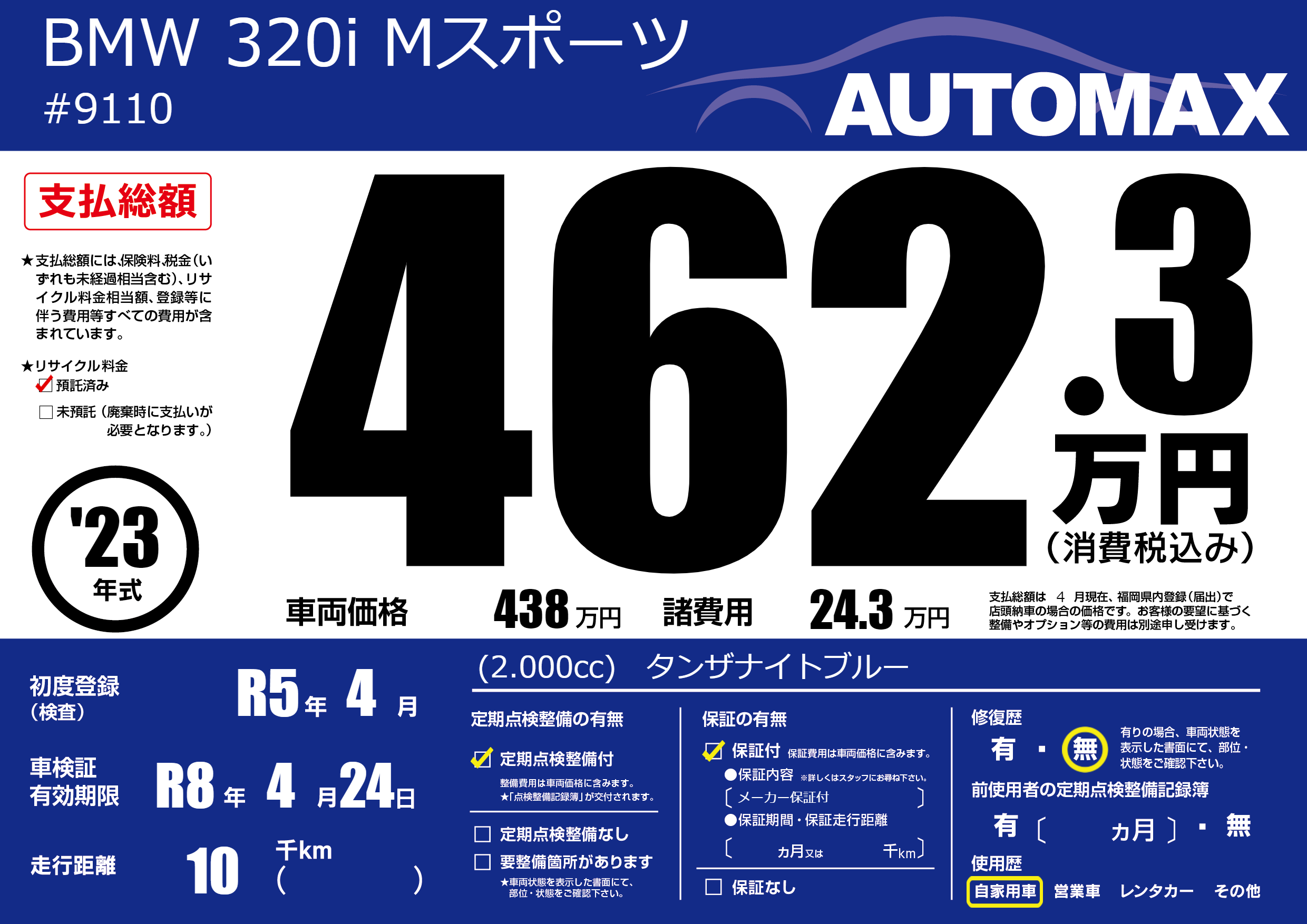 | 車名 | BMW 320i Mスポーツ | グレード ミッション 排気量 |