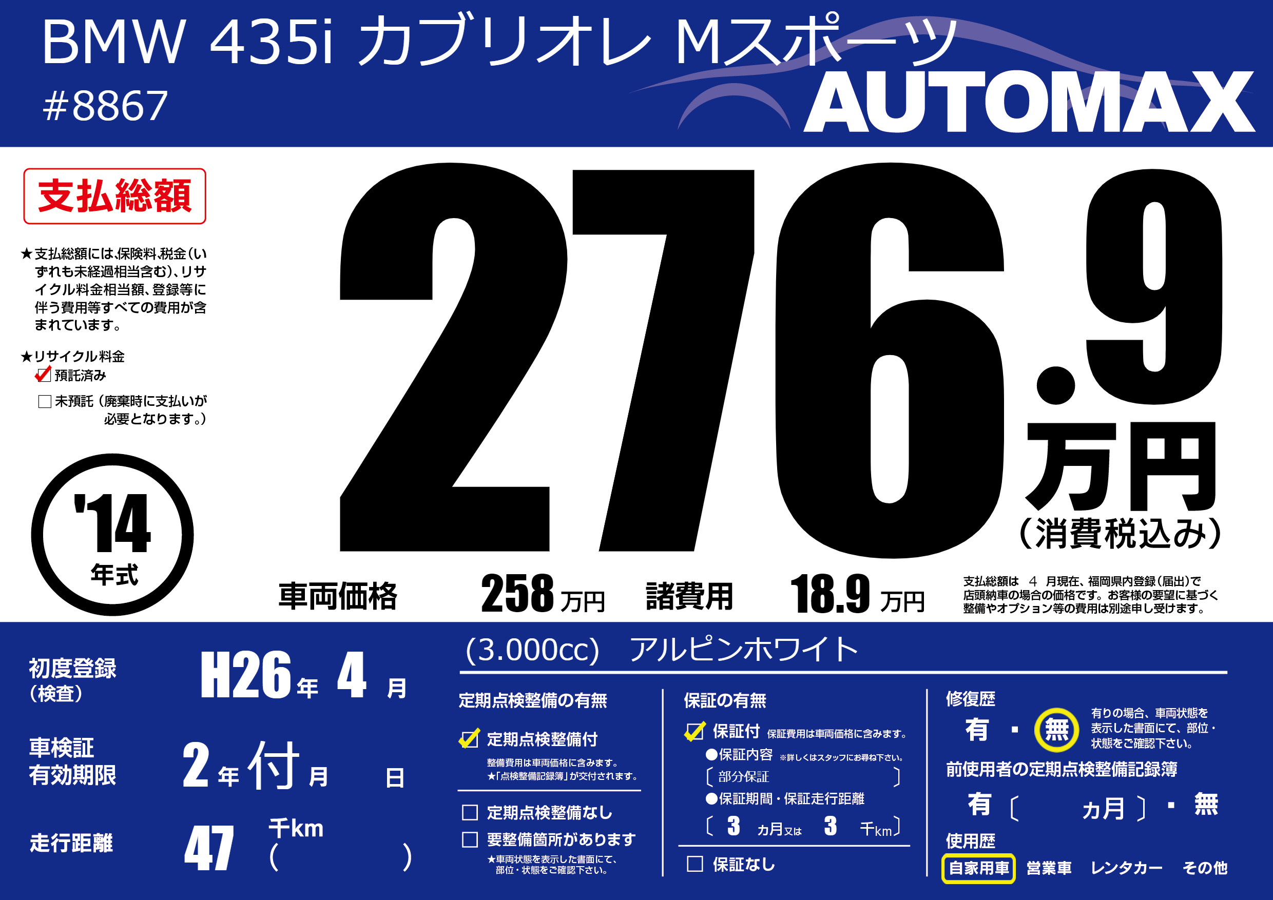 | 車名 | BMW 435i カブリオレ Mスポーツ | グレード ミッション 排気量 |