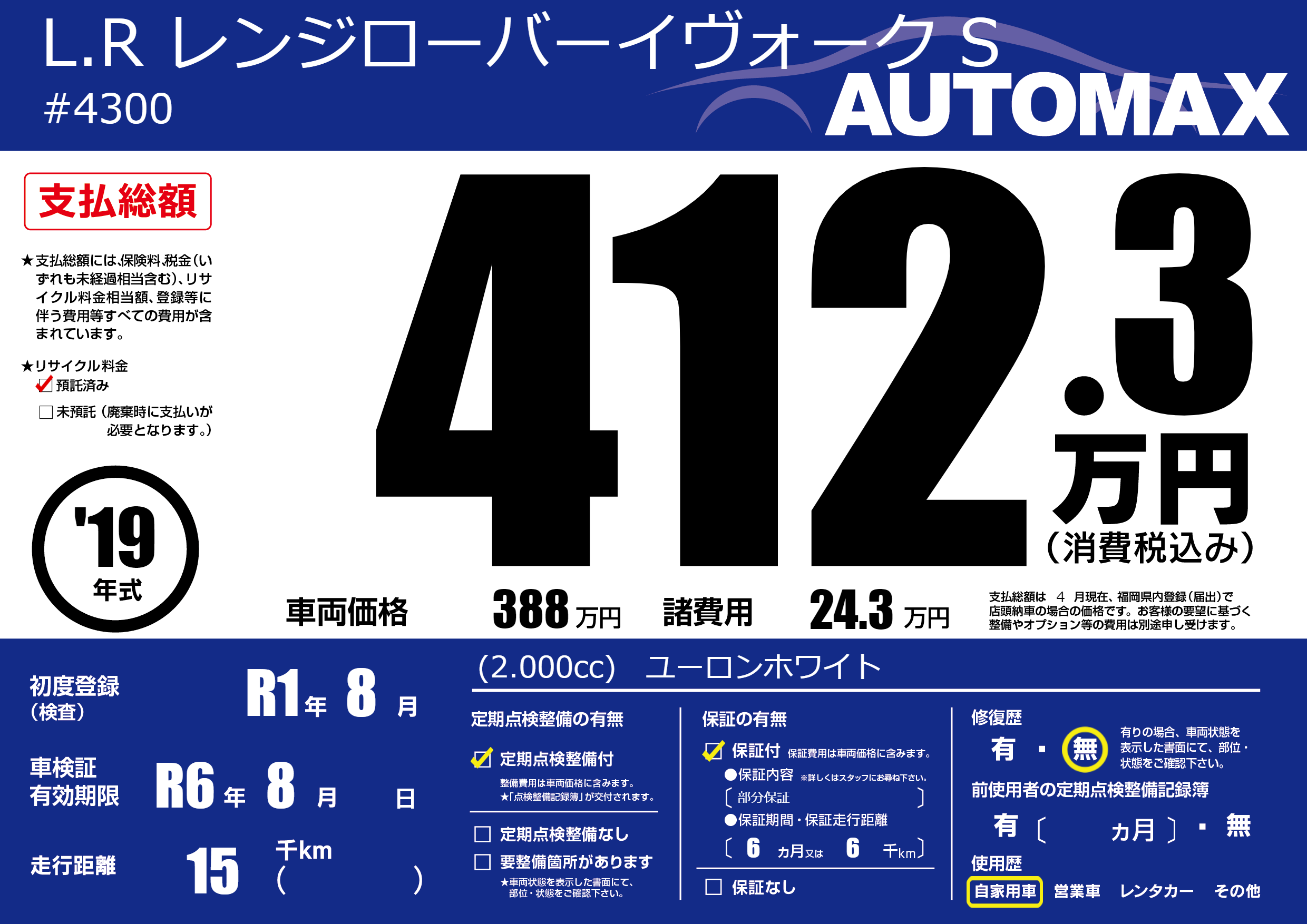 | 車名 | L.R レンジローバーイヴォーク S | グレード ミッション 排気量 |