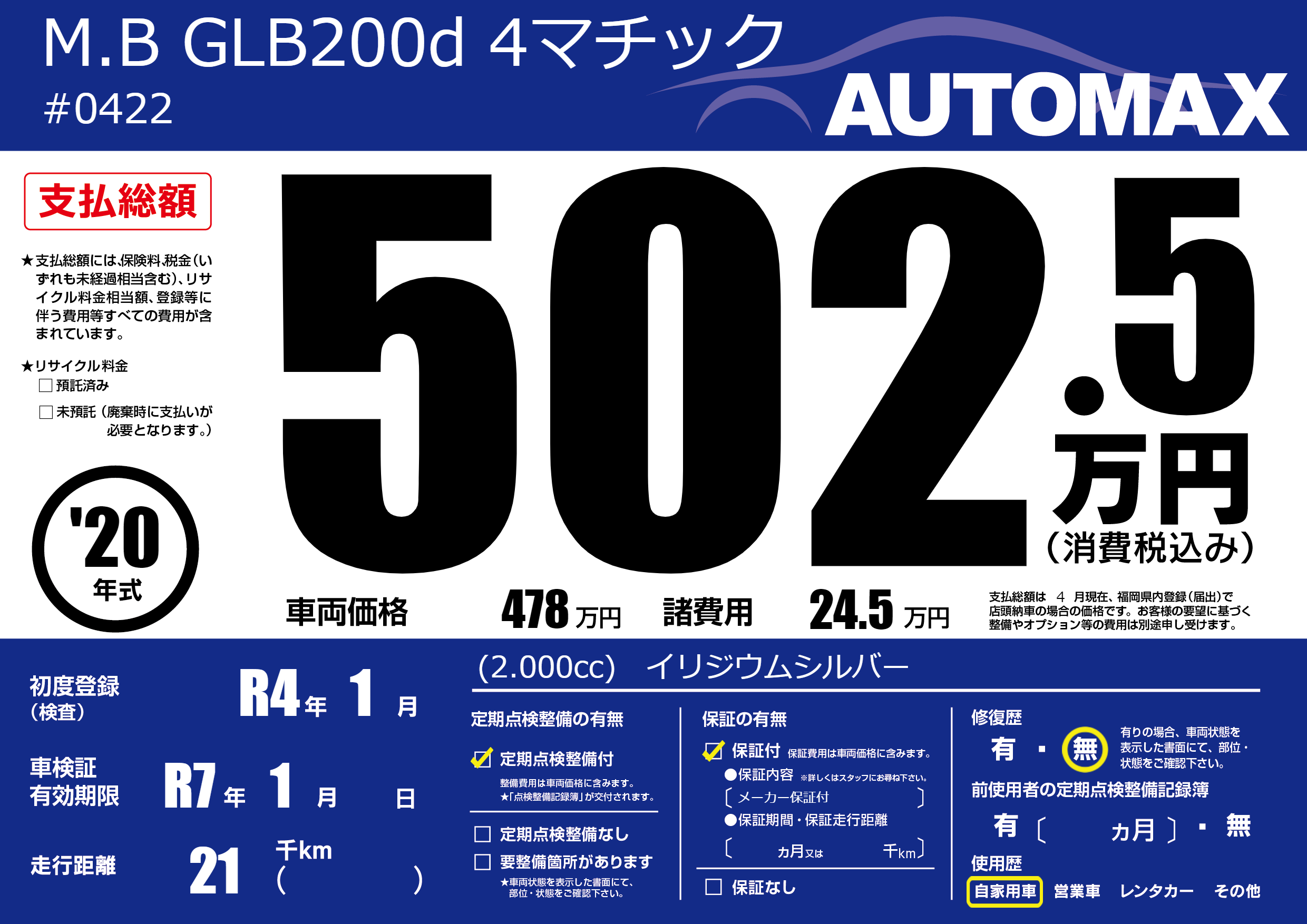 | 車名 | M.B GLB200d 4マチック | グレード ミッション 排気量 |