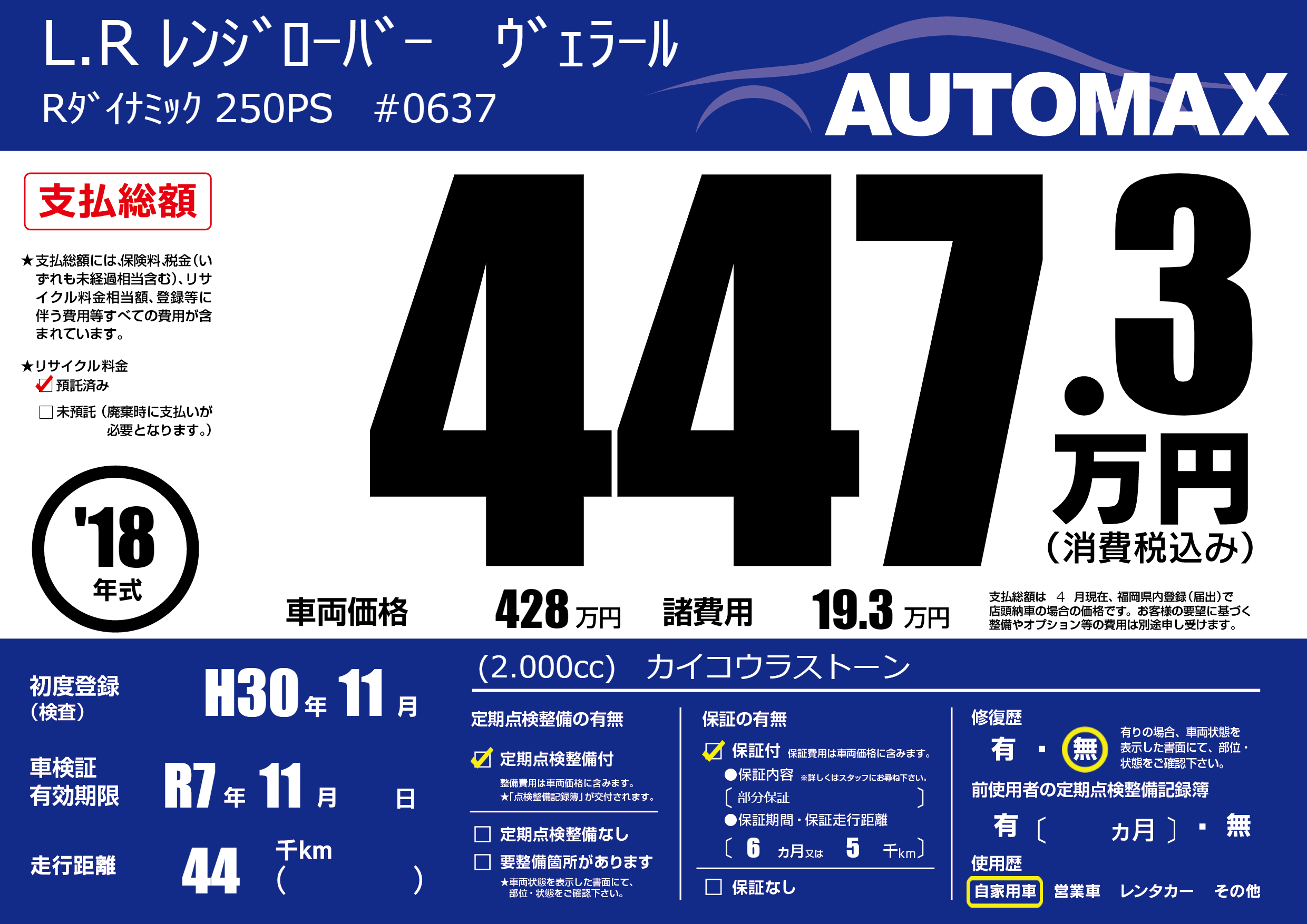 | 車名 | L.R レンジローバー ヴェラール | グレード ミッション 排気量 |