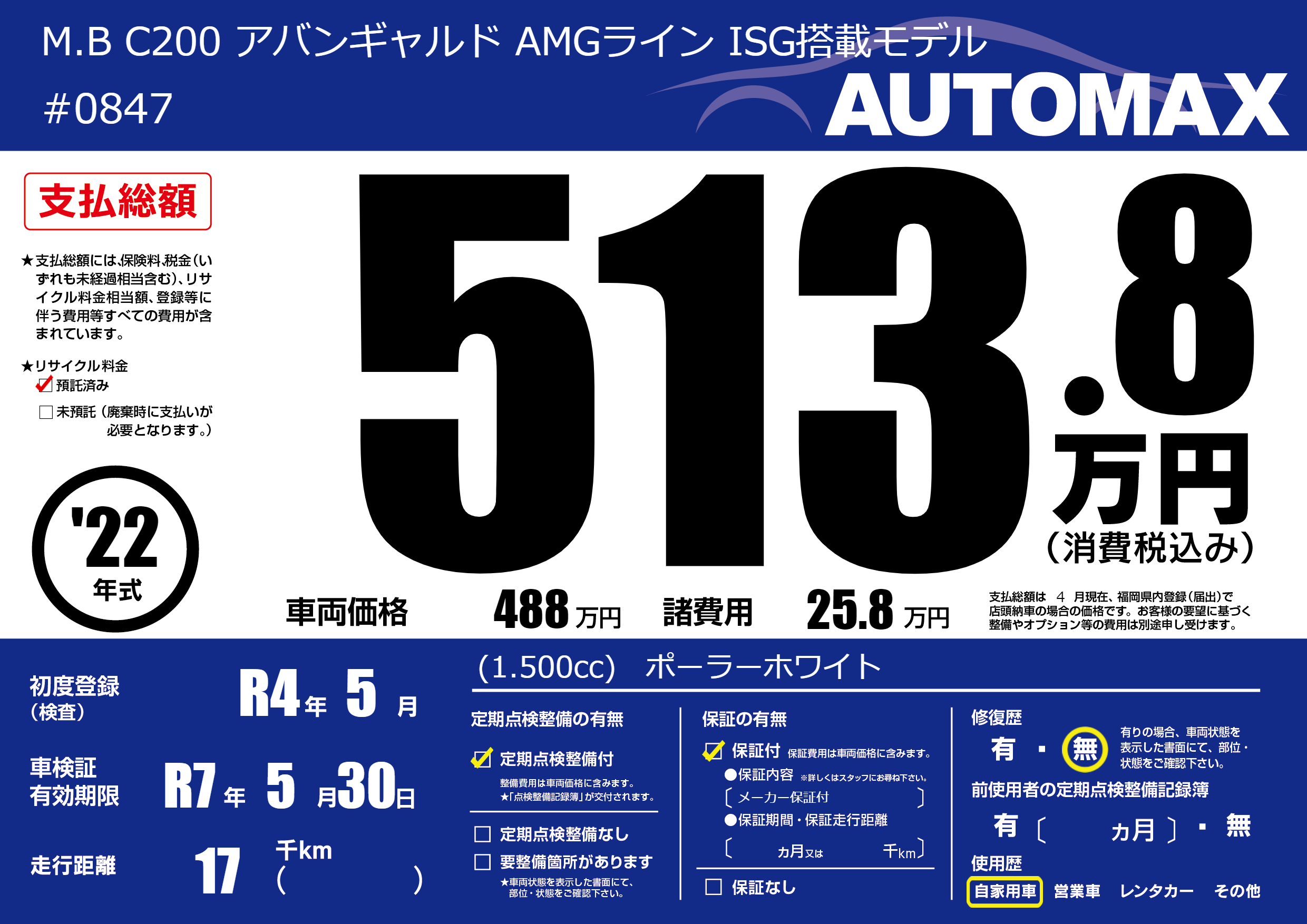 | 車名 | M.B C200 アバンギャルド AMGライン ISG搭載モデル | グレード ミッション 排気量 |