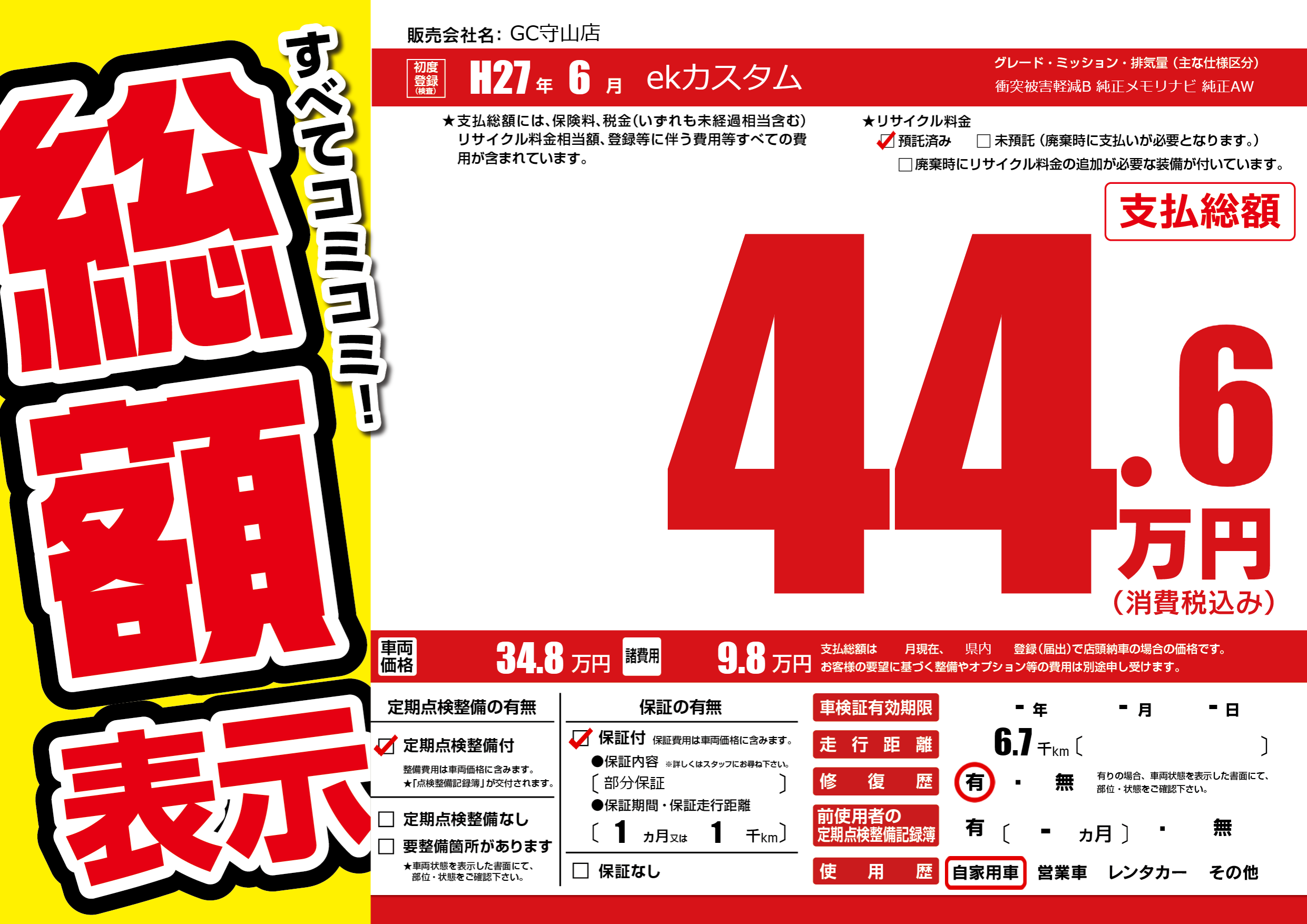 | 車名 | ekカスタム | グレード ミッション 排気量 |